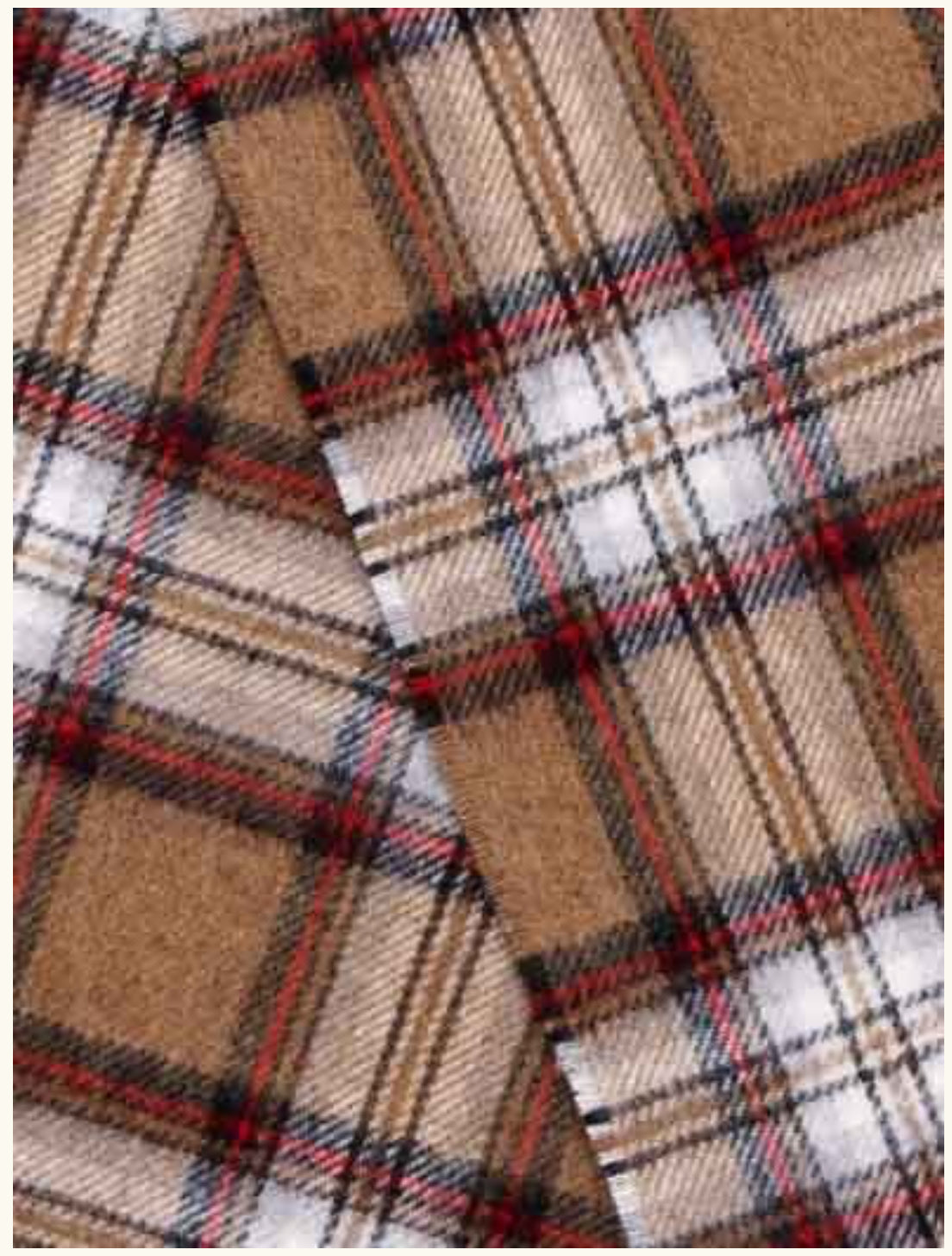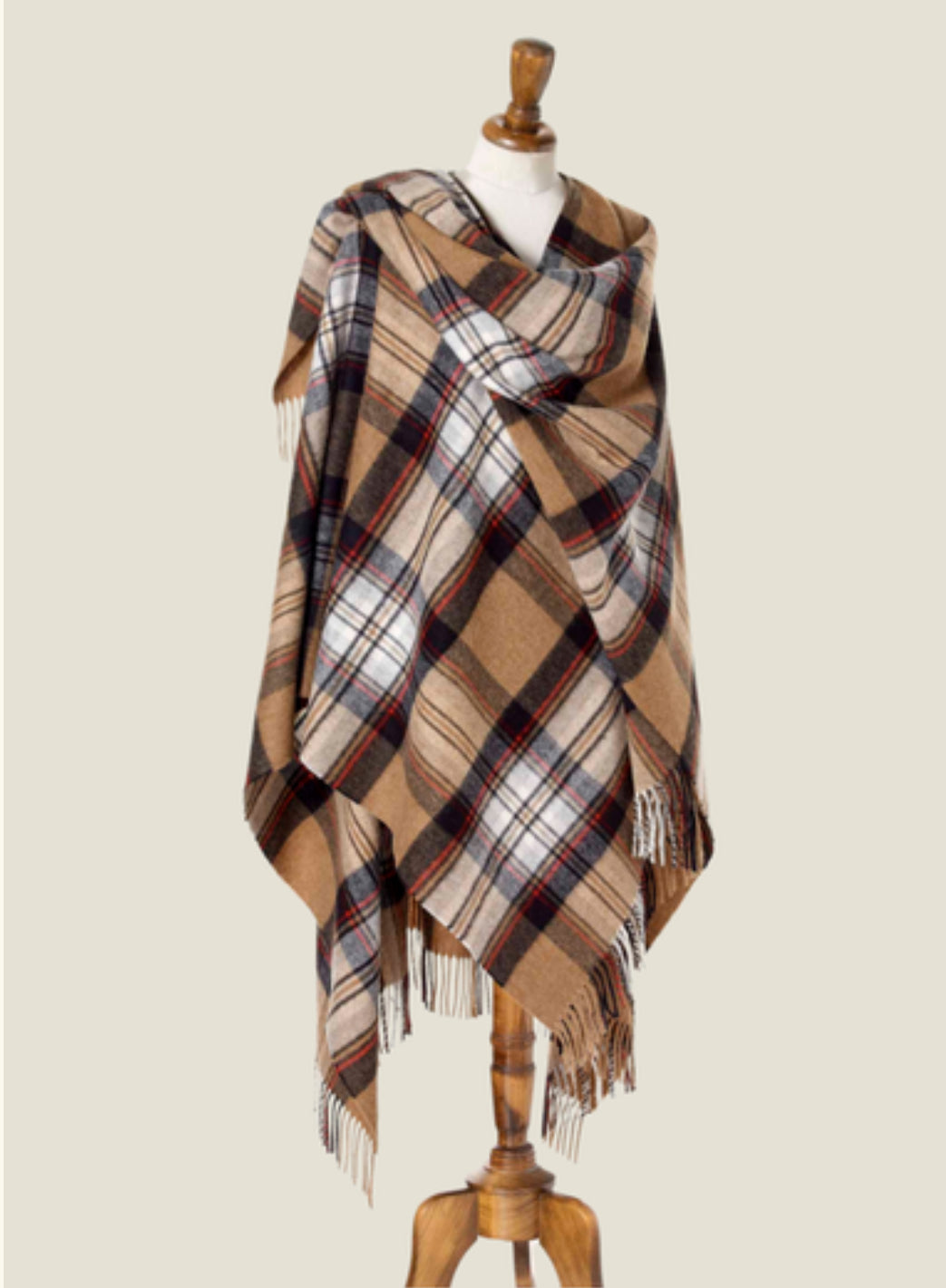 The Camel Stewart Large Tartan Merino Ruana blends neutral camel tones with the classic elegance of the Stewart tartan.