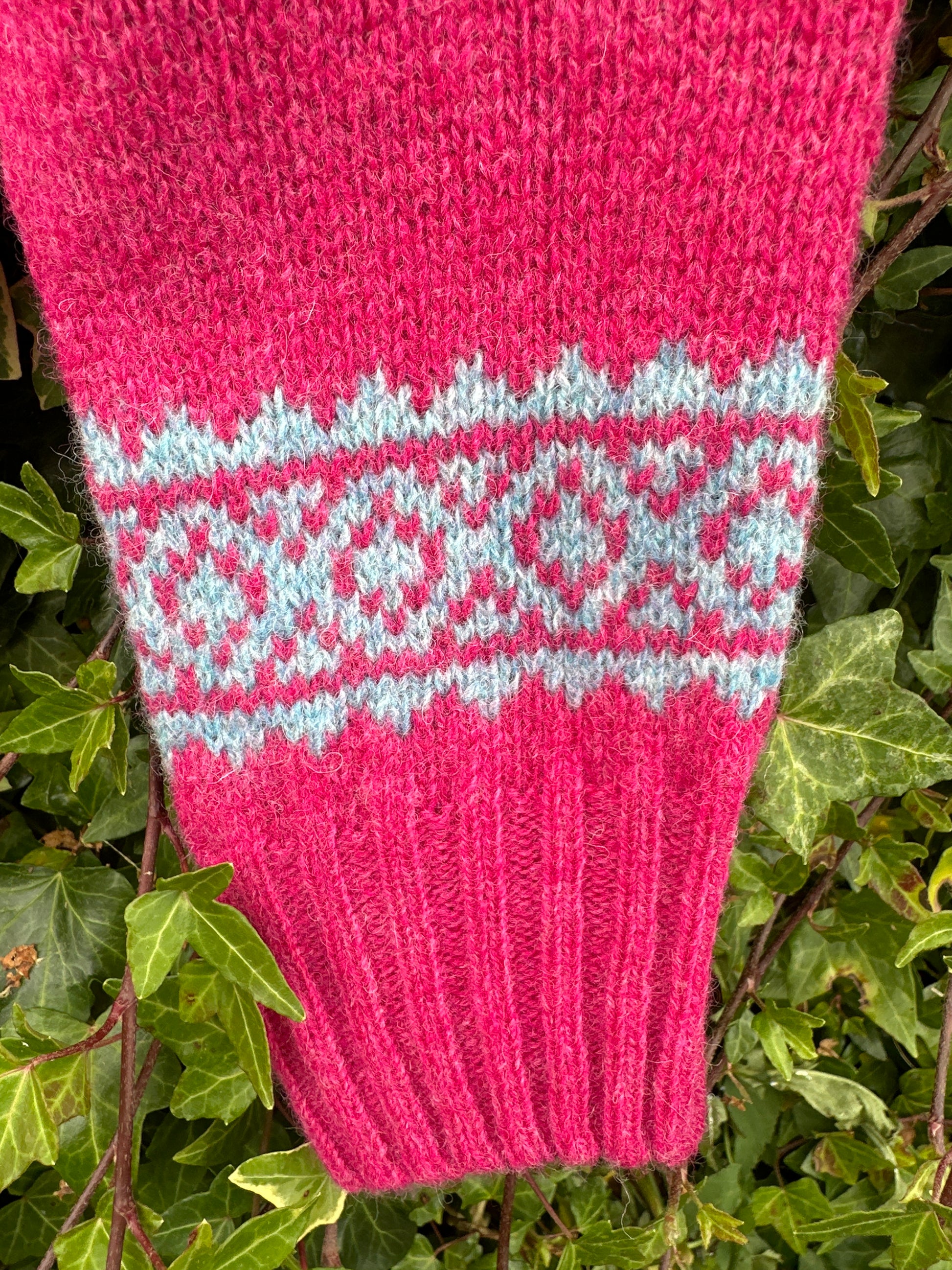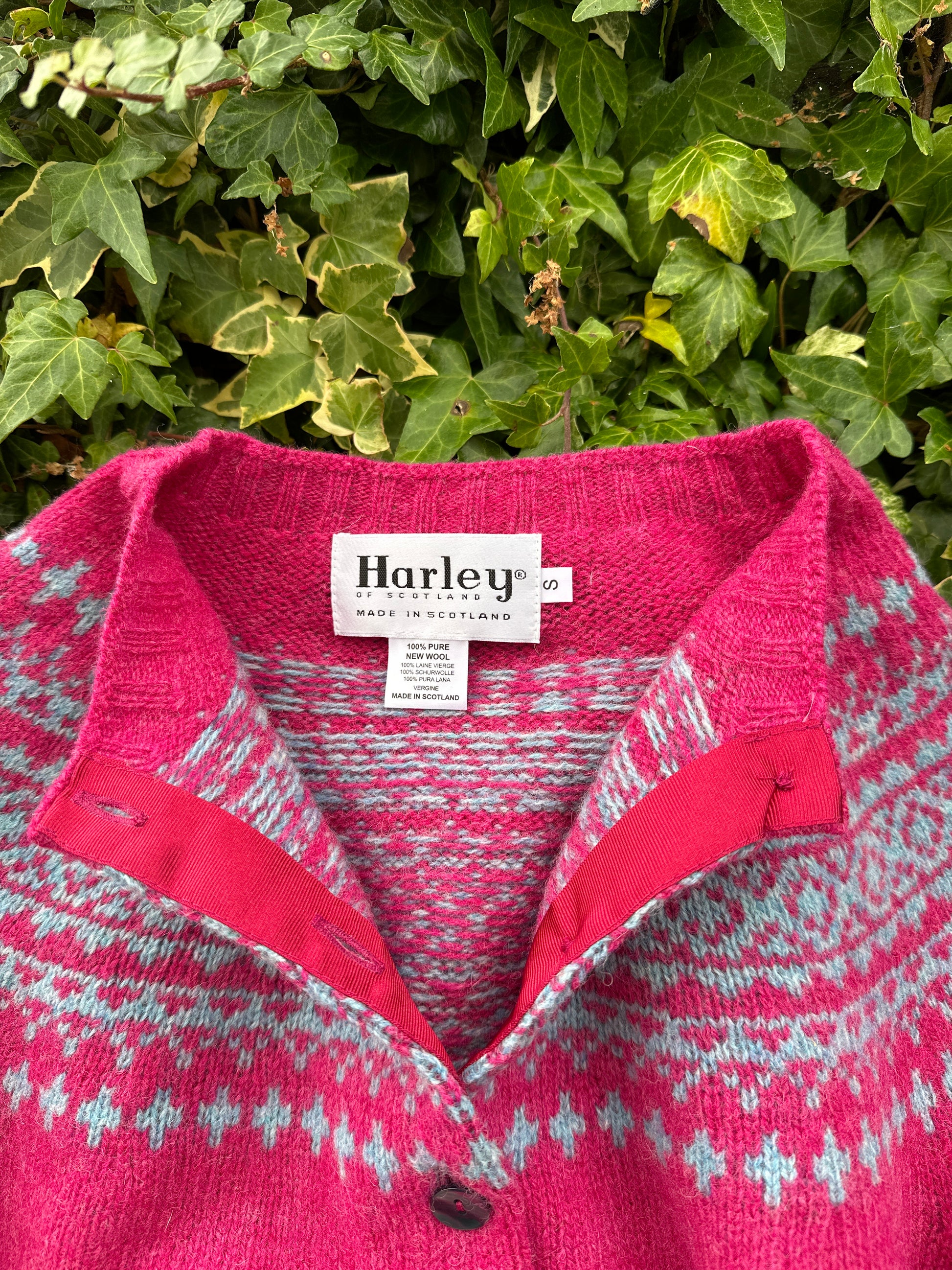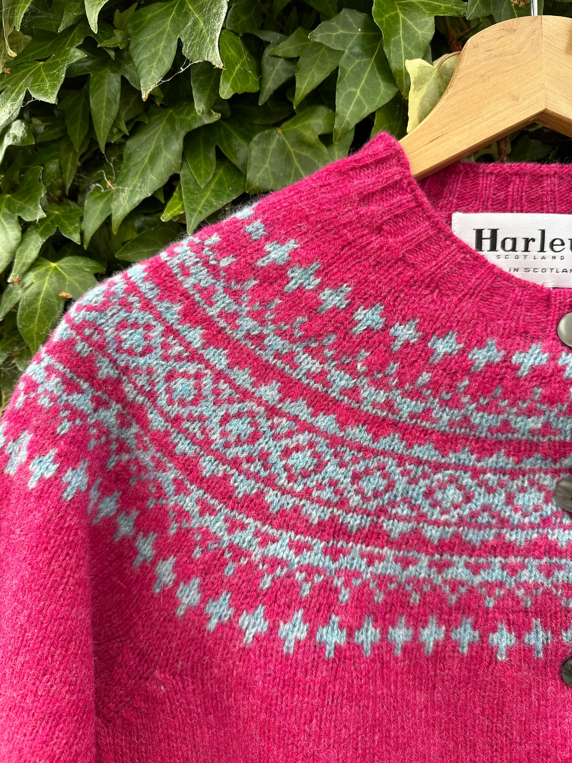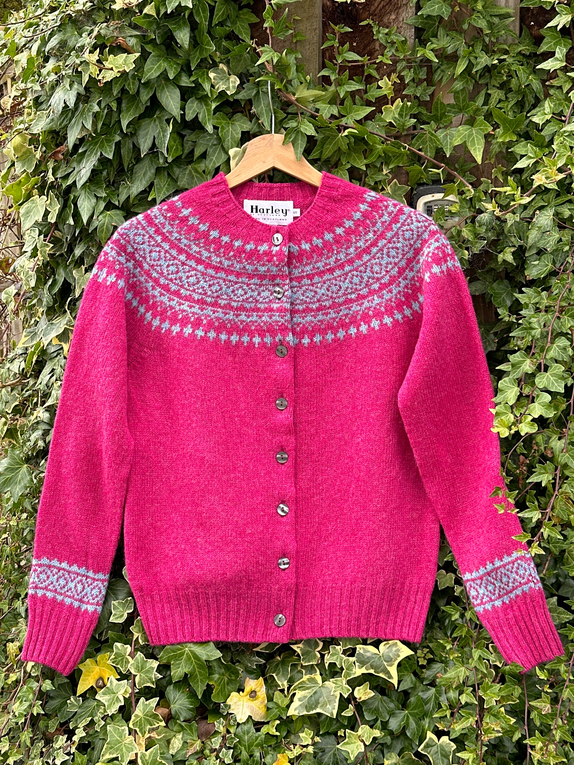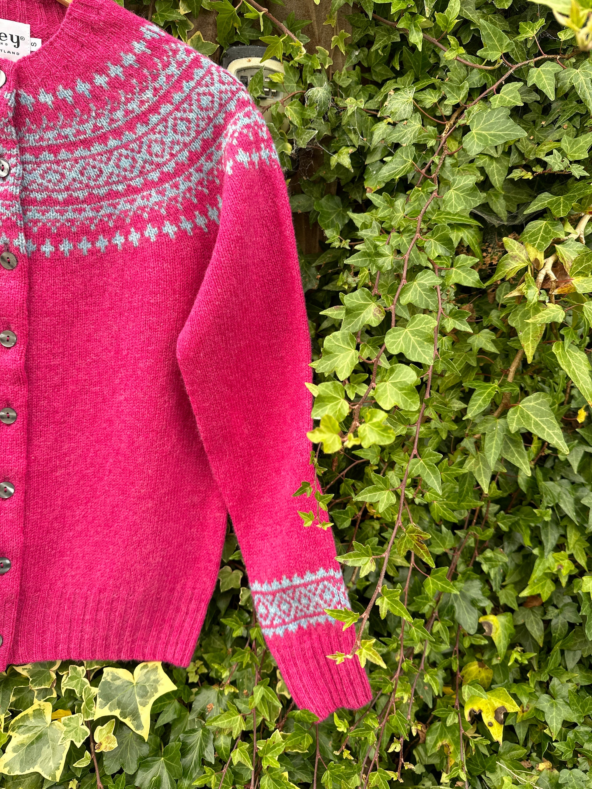 This is a beautiful cardigan in a stunning carnation colourway, a lovely, vibrant piece of Scottish knitwear, perfect for layering in our cooler weather!