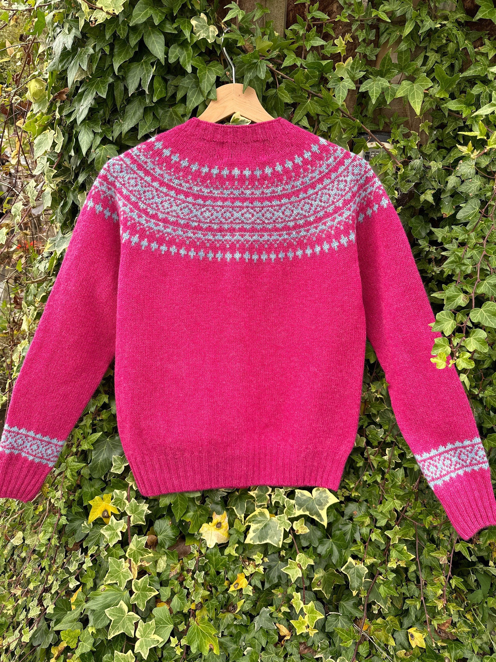 Harley Of Scotland Carnation & Duckegg Crew Neck Fair Isle Cardigan