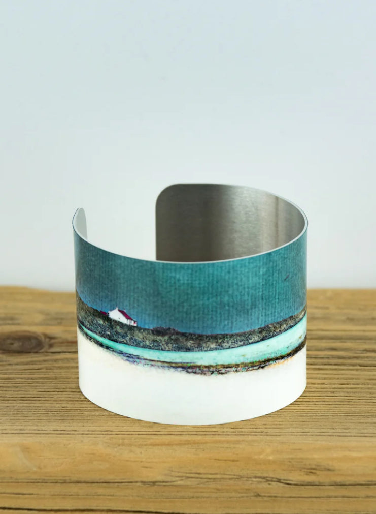 Cath’s Scottish landscape artwork on a lightweight, glossy aluminium cuff bangle presented in a black two piece branded gift box.
