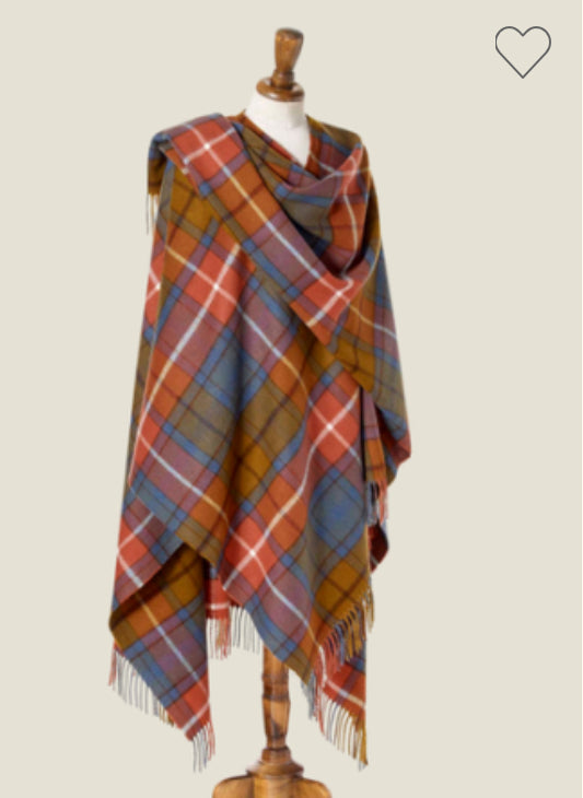 The Antique Buchanan Large Tartan Merino Ruana features warm tones of gold, red and green, celebrating the legacy of Clan Buchanan. This historic tartan reflects deep connections to nature and tradition.