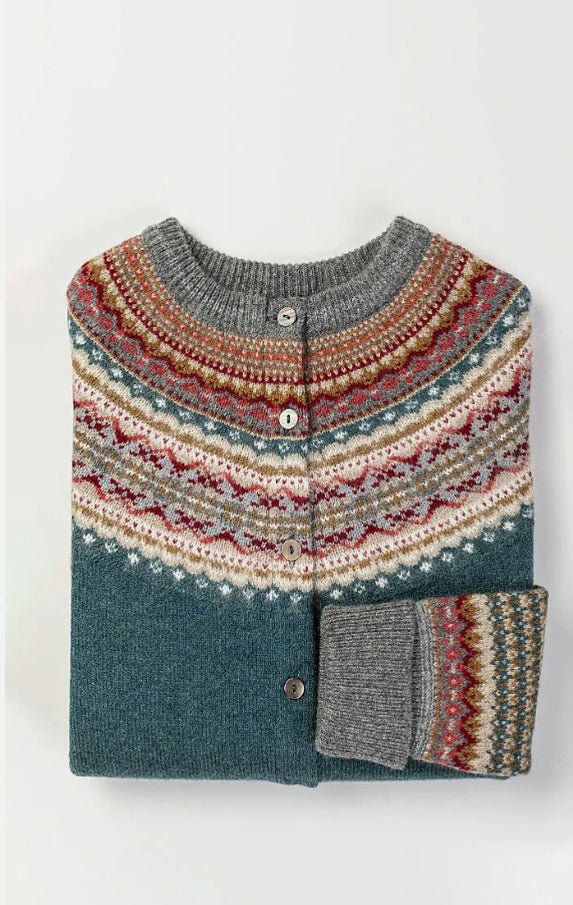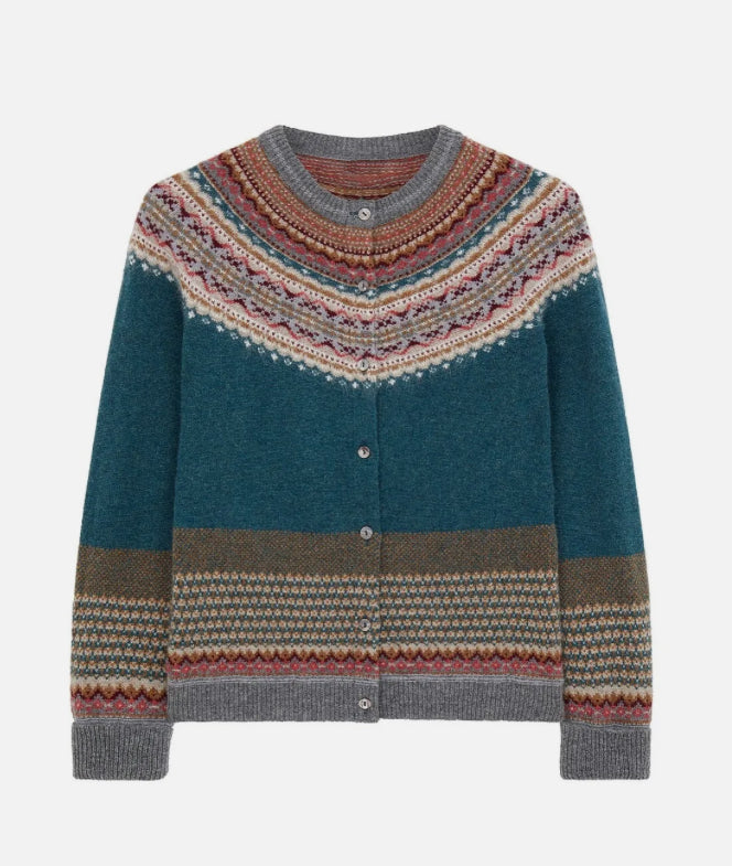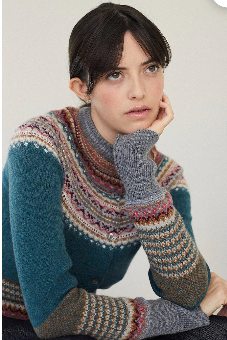 This is an Eribe signature style cardigan, the iconic fairisle pattern yoke Merino Wool cardigan has a slightly shaped waist for a flattering fit and a touch of luxury angora in the yoke for added soft texture.