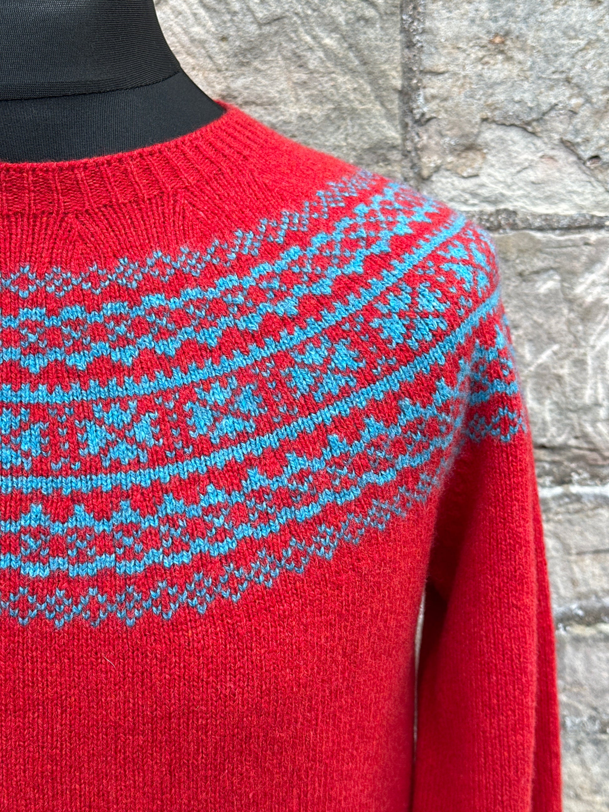 This beautiful sweater has a crew neck, lovely yoke Fairisle across the chest and has a rib finish on the cuffs and hem.