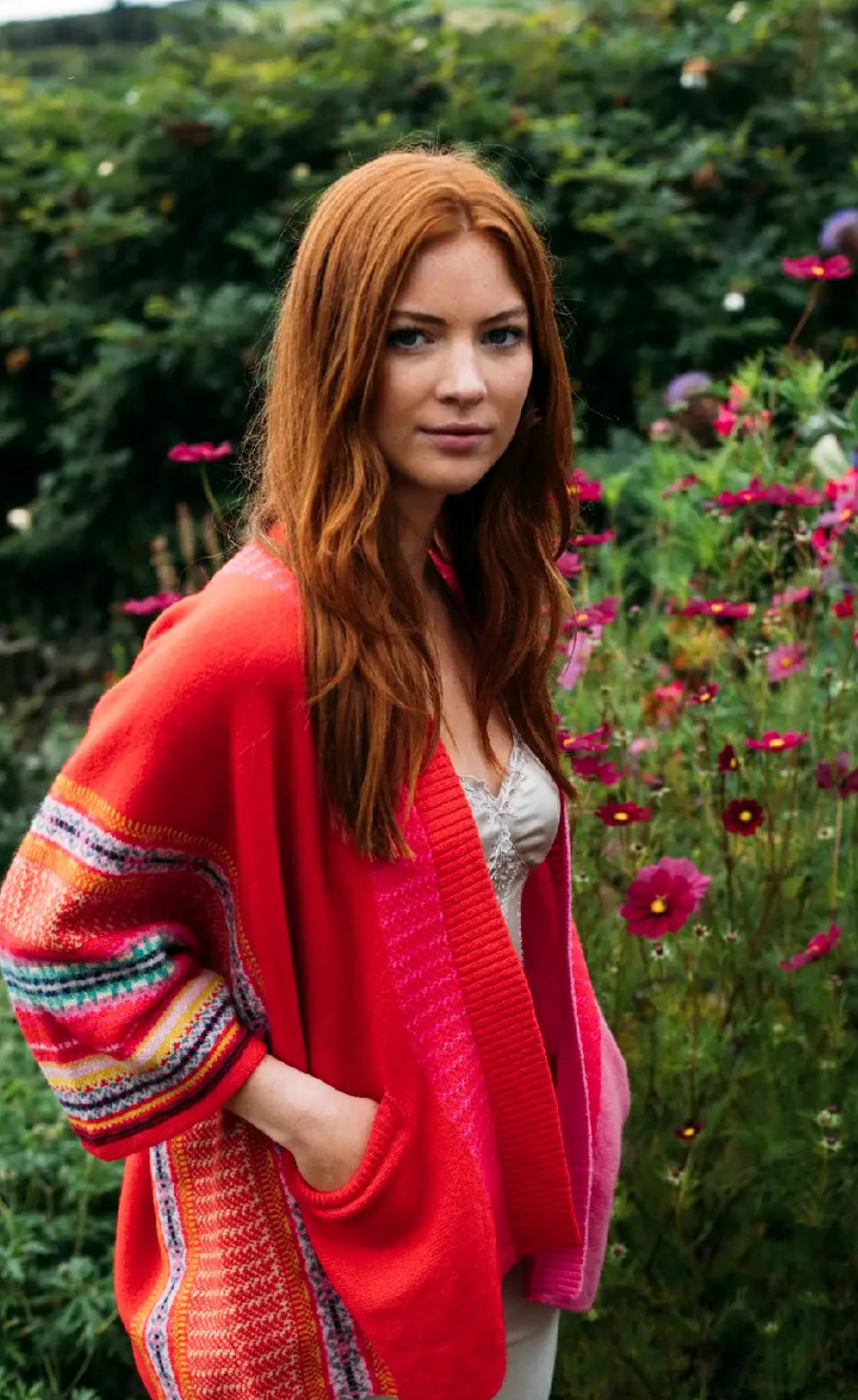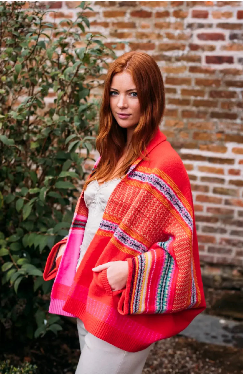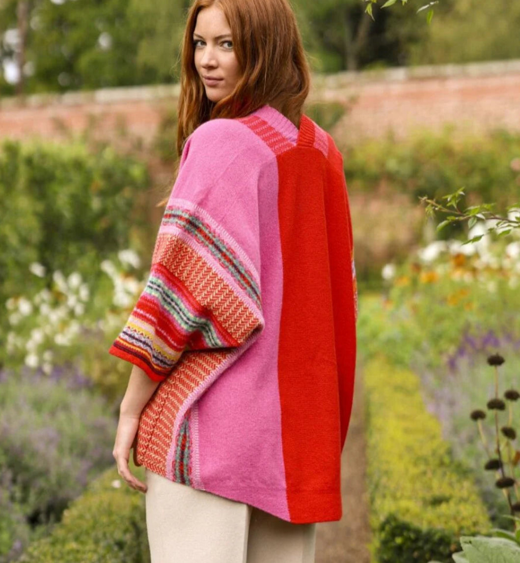A versatile mid-thigh length 100% Merino wool throw-on coatigan with practical deep pockets. Featuring signature Eribe fairisle in a gradient colour change and solid colour blocking combined, it is both functional and on trend with an oversized silhouette.