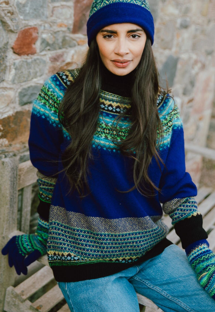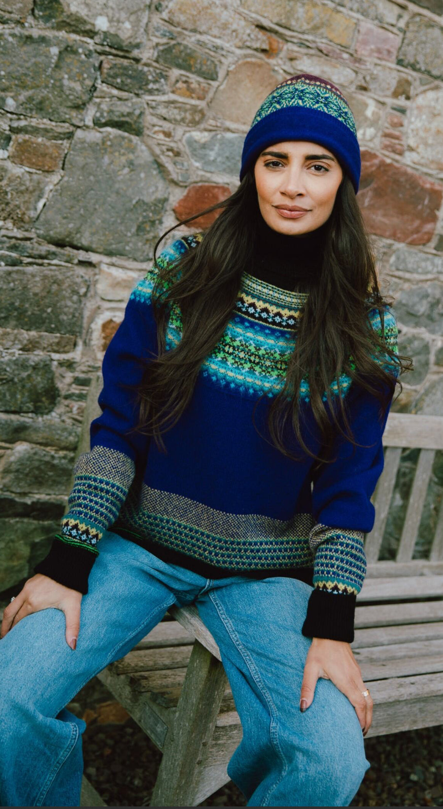 Fairisle and tweed pattern around shoulders, above cuffs and the hem.