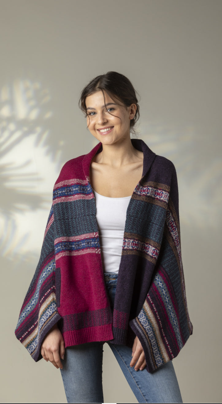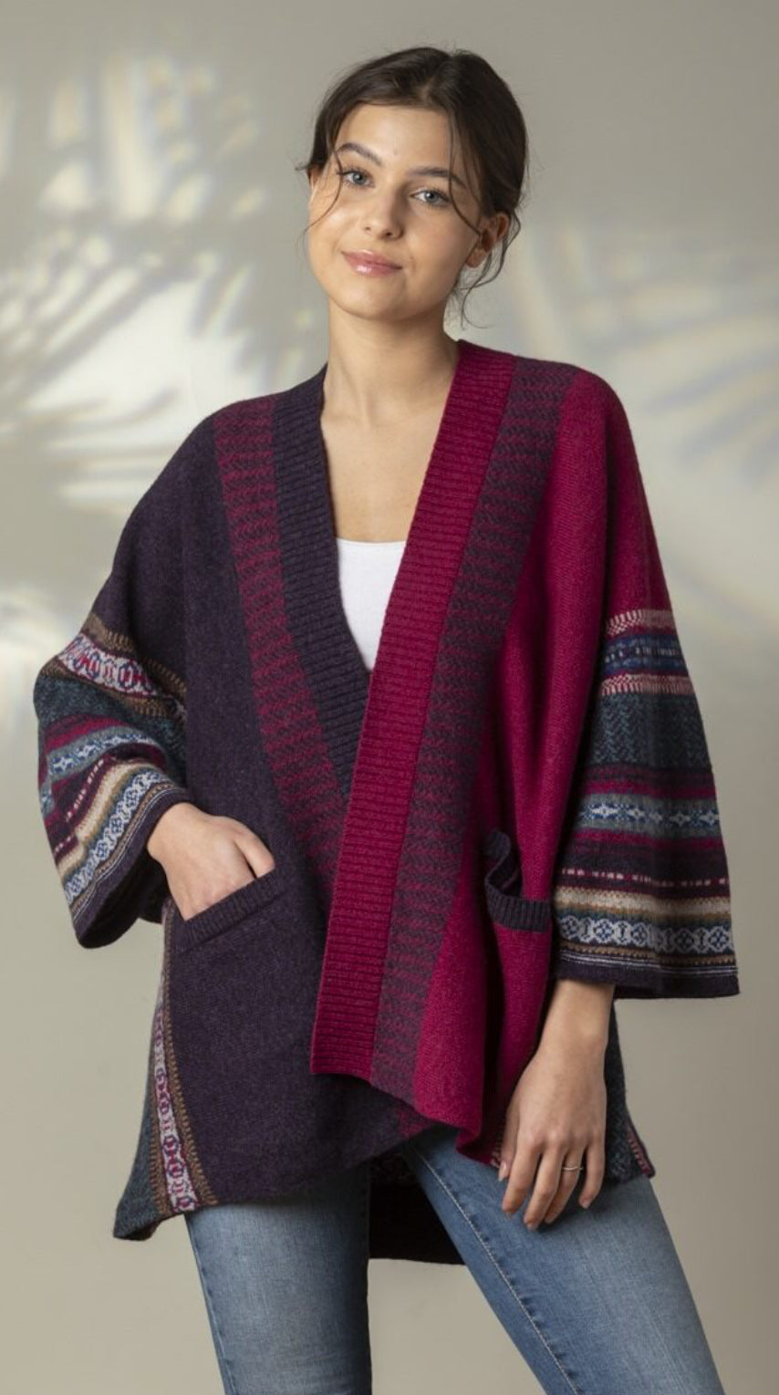 A versatile mid-thigh length 100% Merino wool throw-on coatigan with practical deep pockets. Featuring signature Eribe fairisle in a gradient colour change and solid colour blocking combined, it is both functional and on trend with an oversized silhouette.