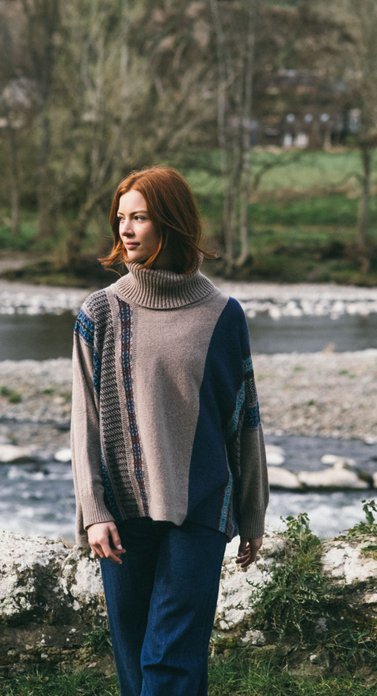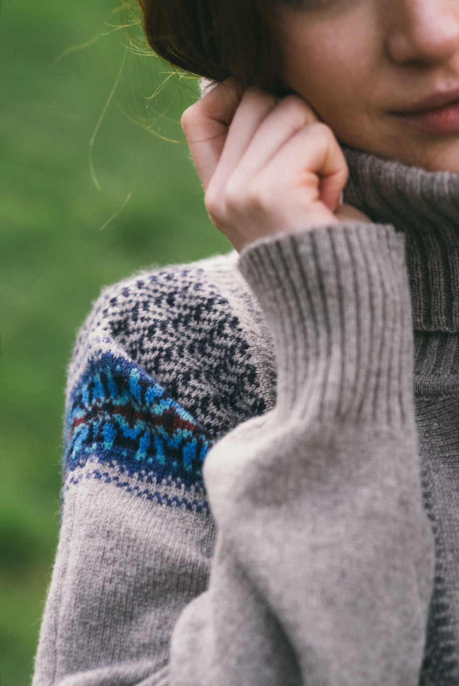 Easy to wear with unique vertical patterns such as Guernsey rib, tweed textures and special ‘Milkchurn’ Fairisle pattern.