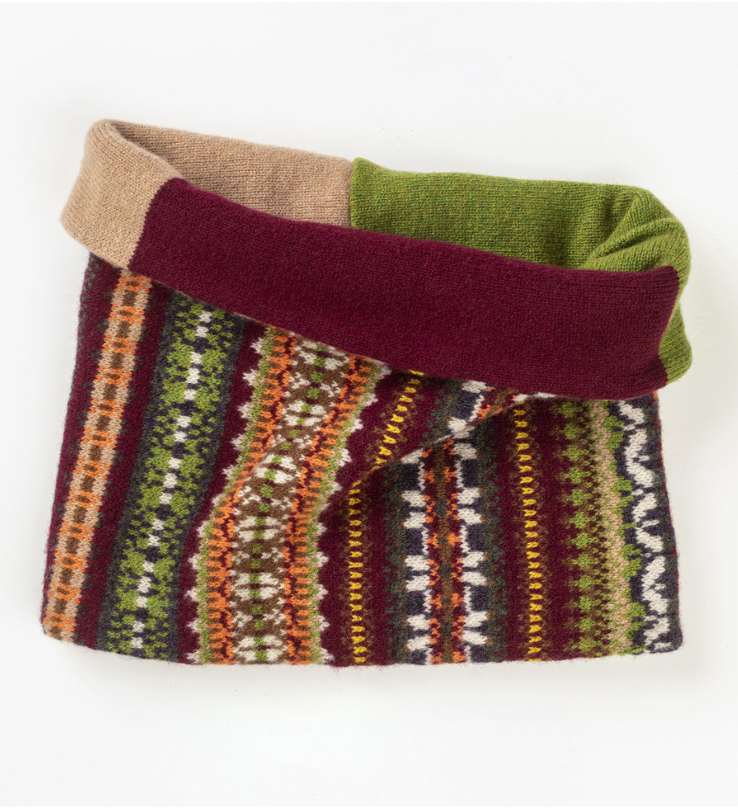 Crafted using the softest 100% Merino Lambswool with a signature Fairisle design on one side and a colour block design on the inside making these s unique, reversible accessory.