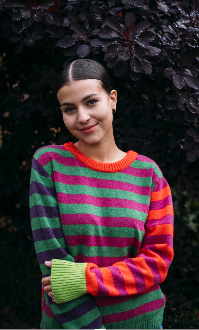 This is a fun loving piece, knit using the softest 100% Merino Lambswool with rib cuffs in funky contrasting colours.