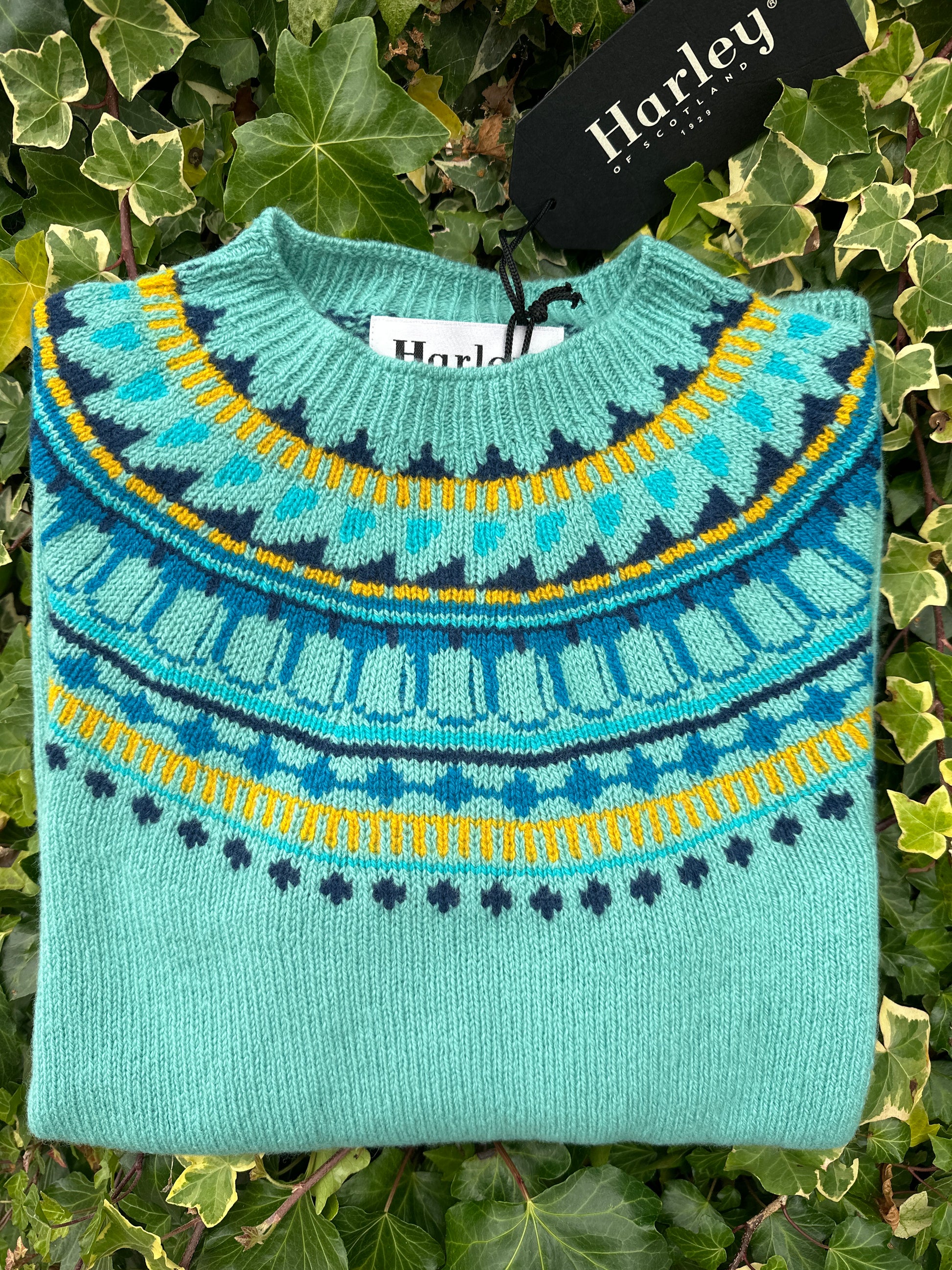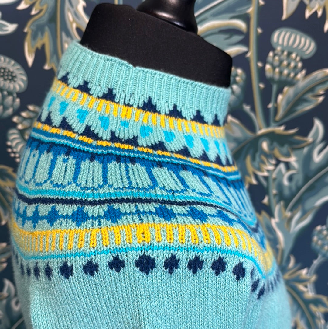This is a stunning Harley of Scotland fairisle sweater. Established in 1929 - Harley of Scotland are market leaders in seam free whole garment knitwear. With a heritage anchored in fair isle knitting techniques.