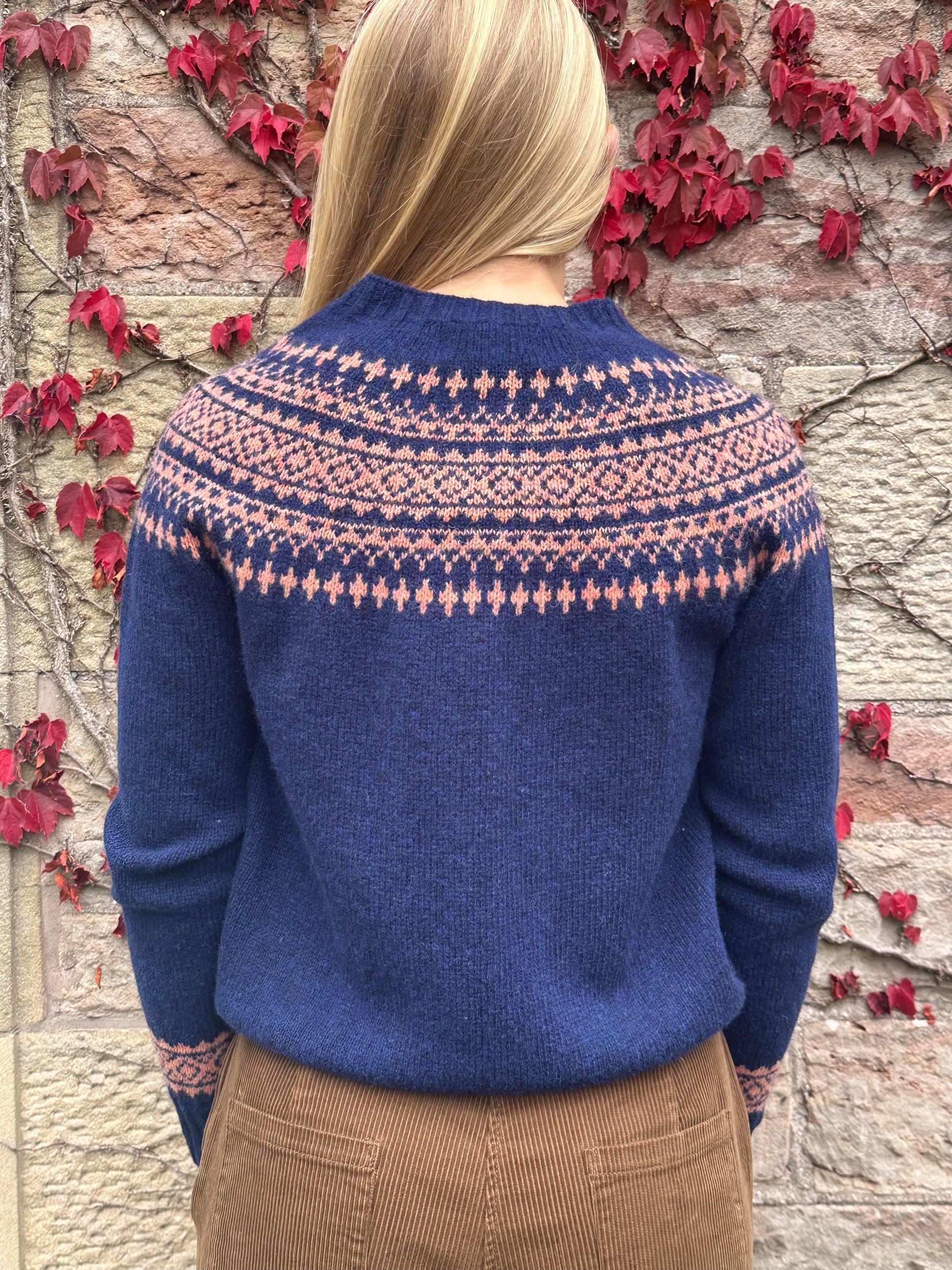 Knit in a lovely dark navy with a striking Peach Fair Isle yoke, crew neck and a Fair Isle detail to the cuffs.