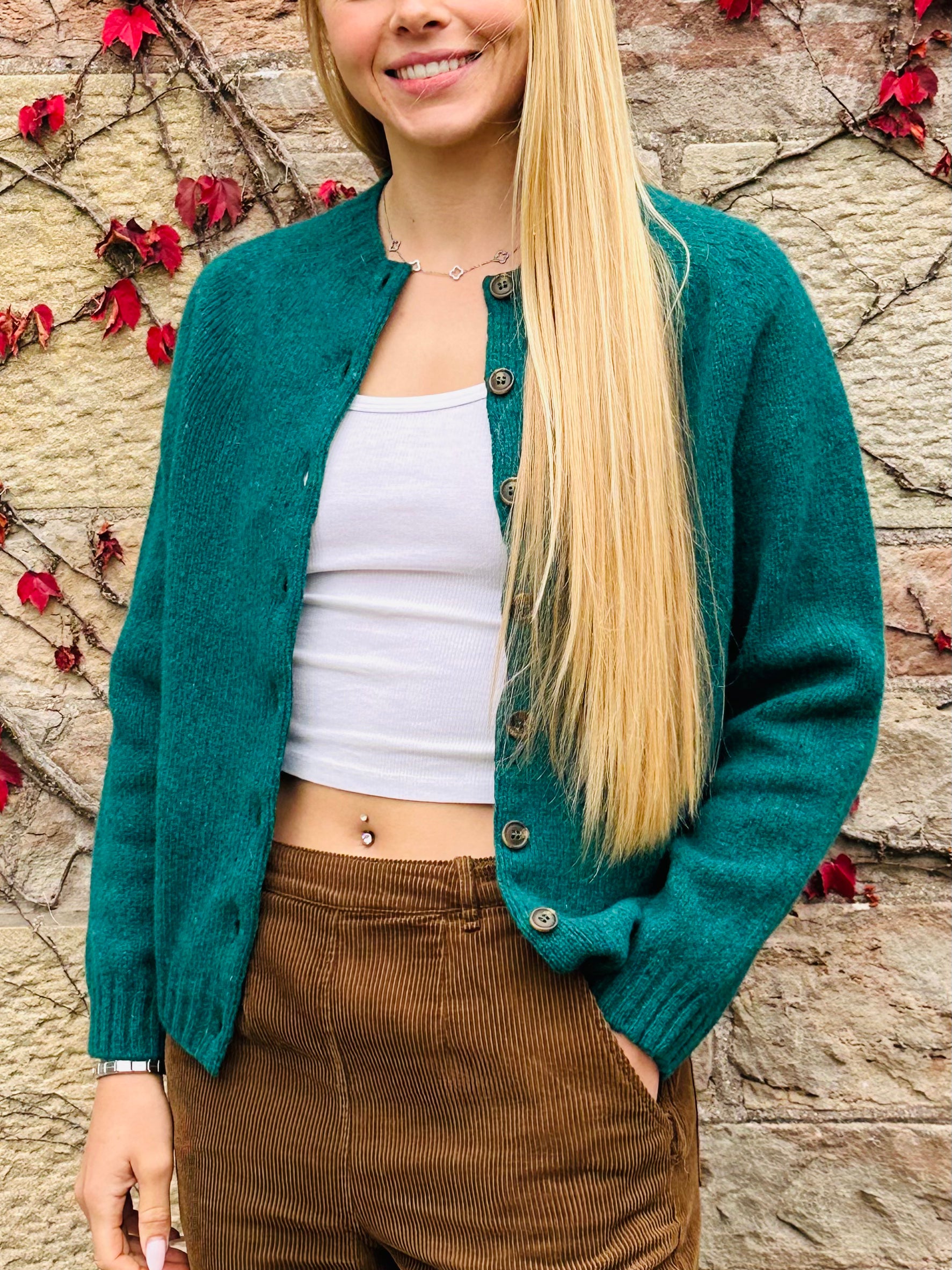 Stunning new colourway for 2025 - Harley Of Scotlands classic crew neck cardigan in colourway ‘Bute’ - a vibrant shade of grassy green.