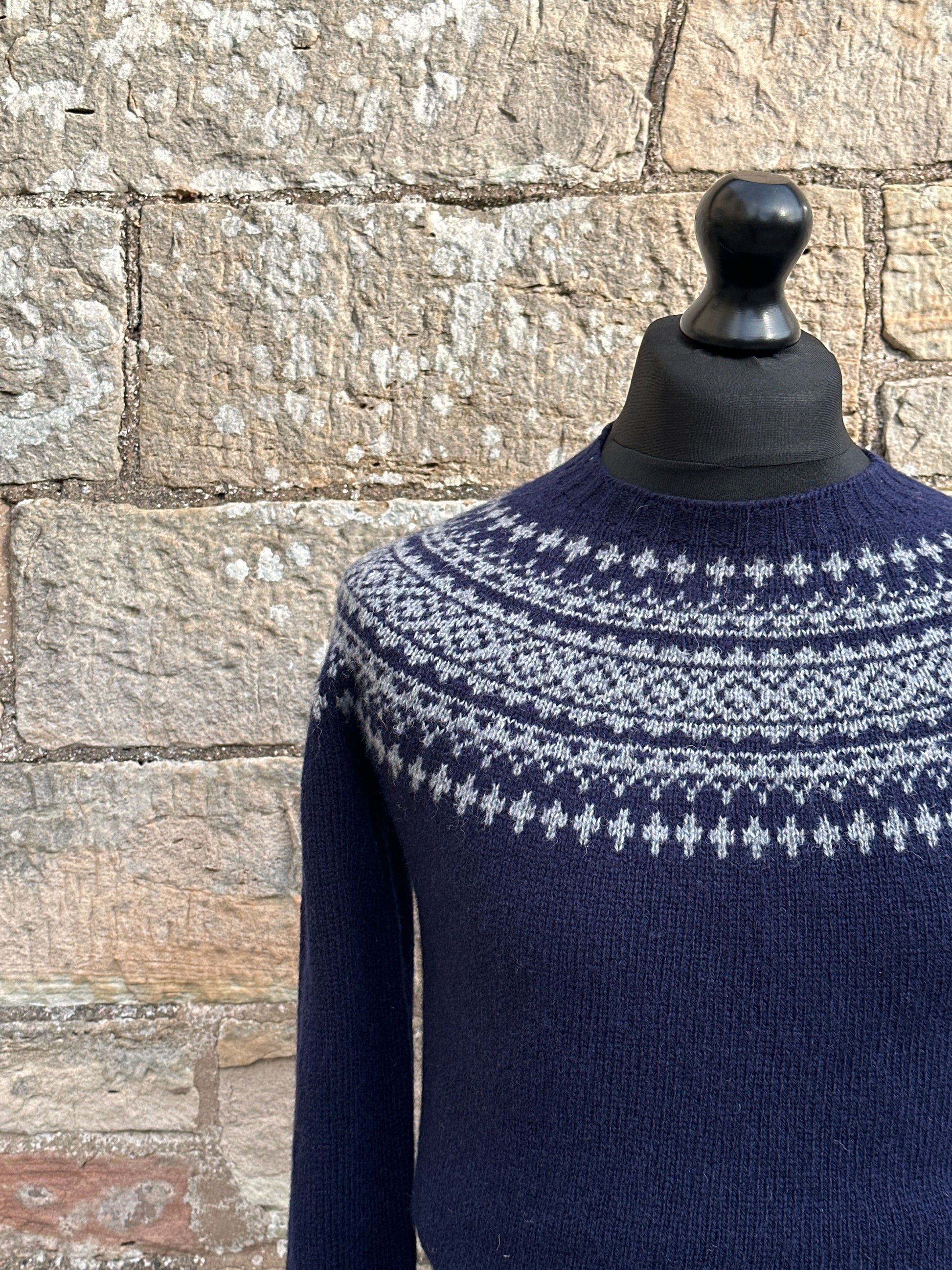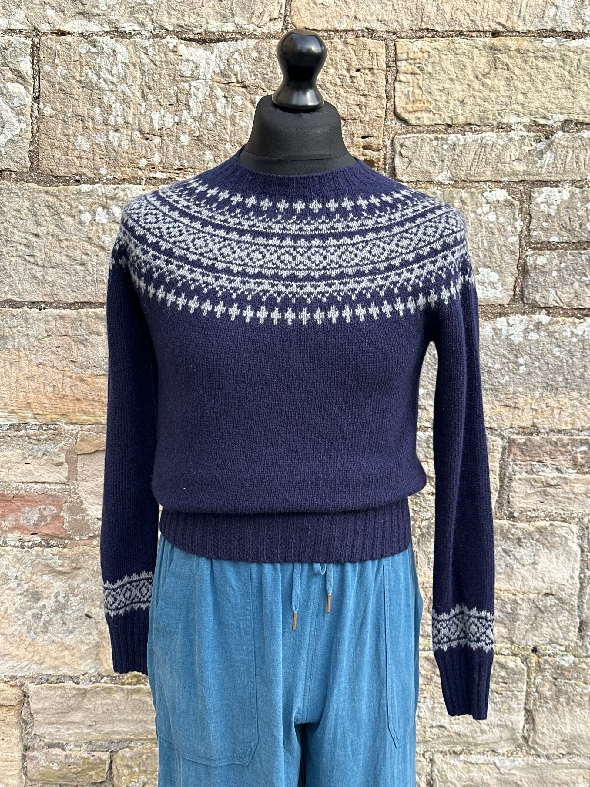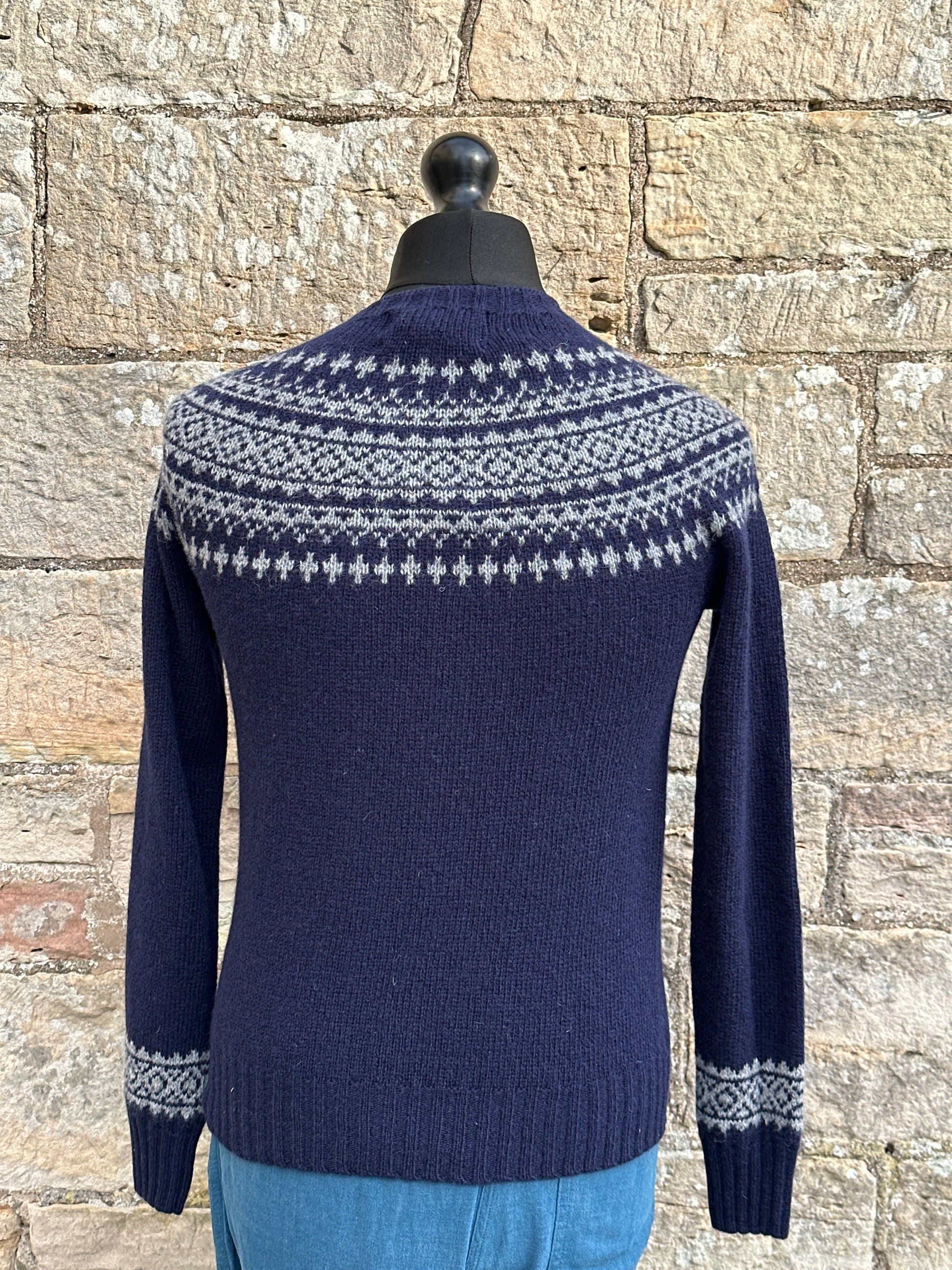 A real classic navy blue & mid grey ladies Fairisle sweater, knit and designed In Scotland by renowned designers Harley Of Scotland.