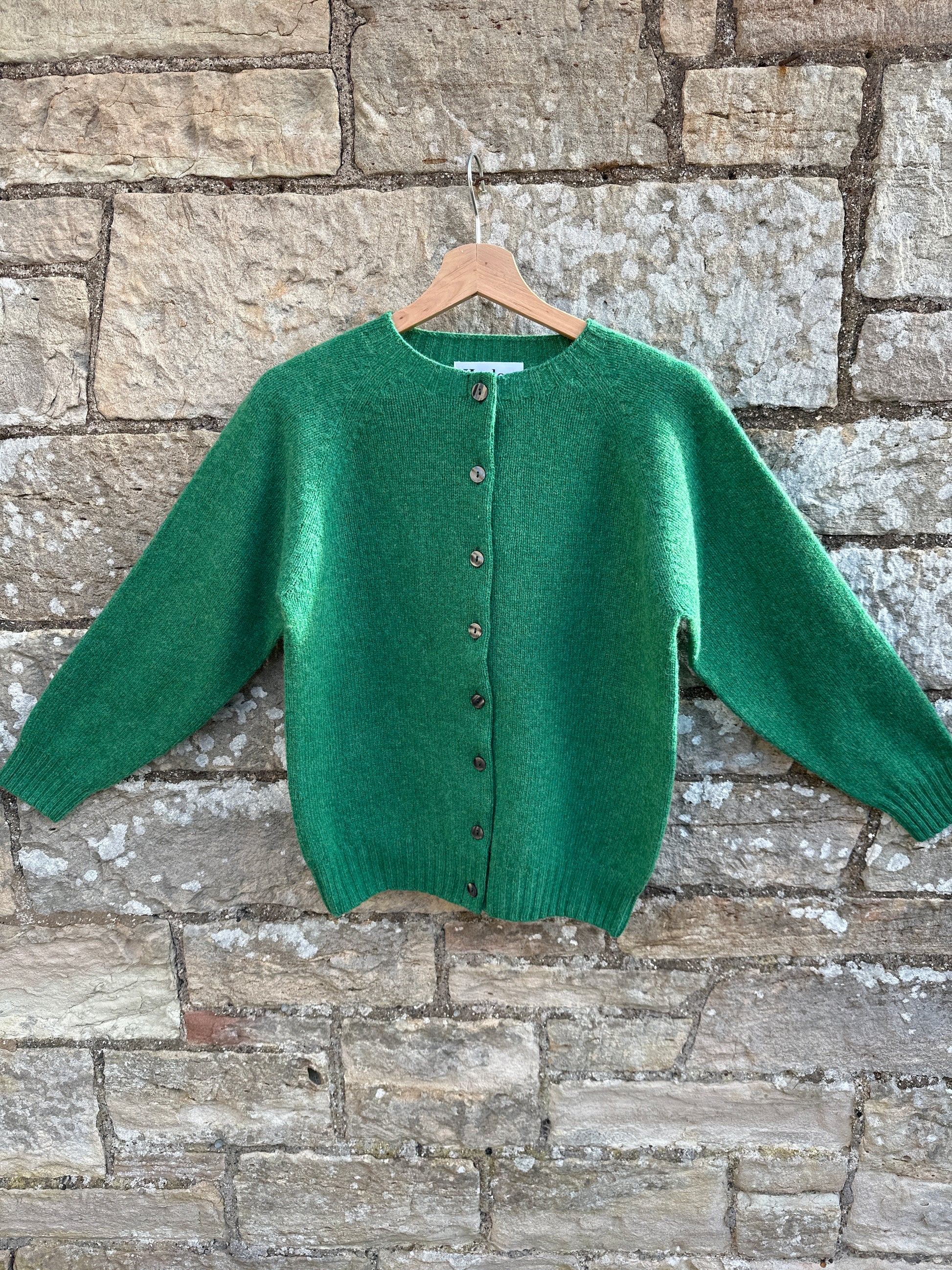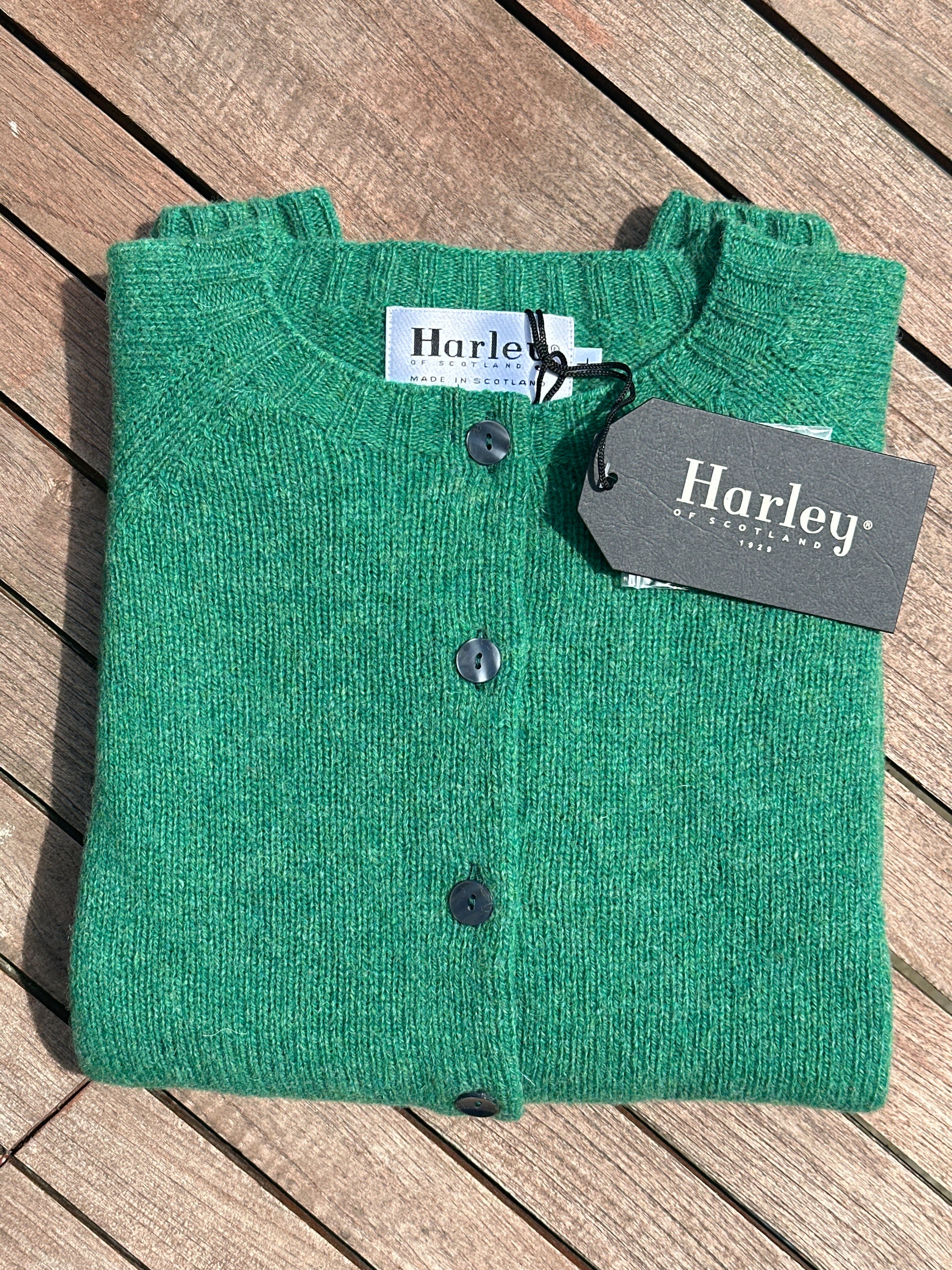 Stunning new colourway for 2025 - Harley Of Scotlands classic crew neck cardigan in colourway ‘Pixie’ - a vibrant shade of grassy green.
