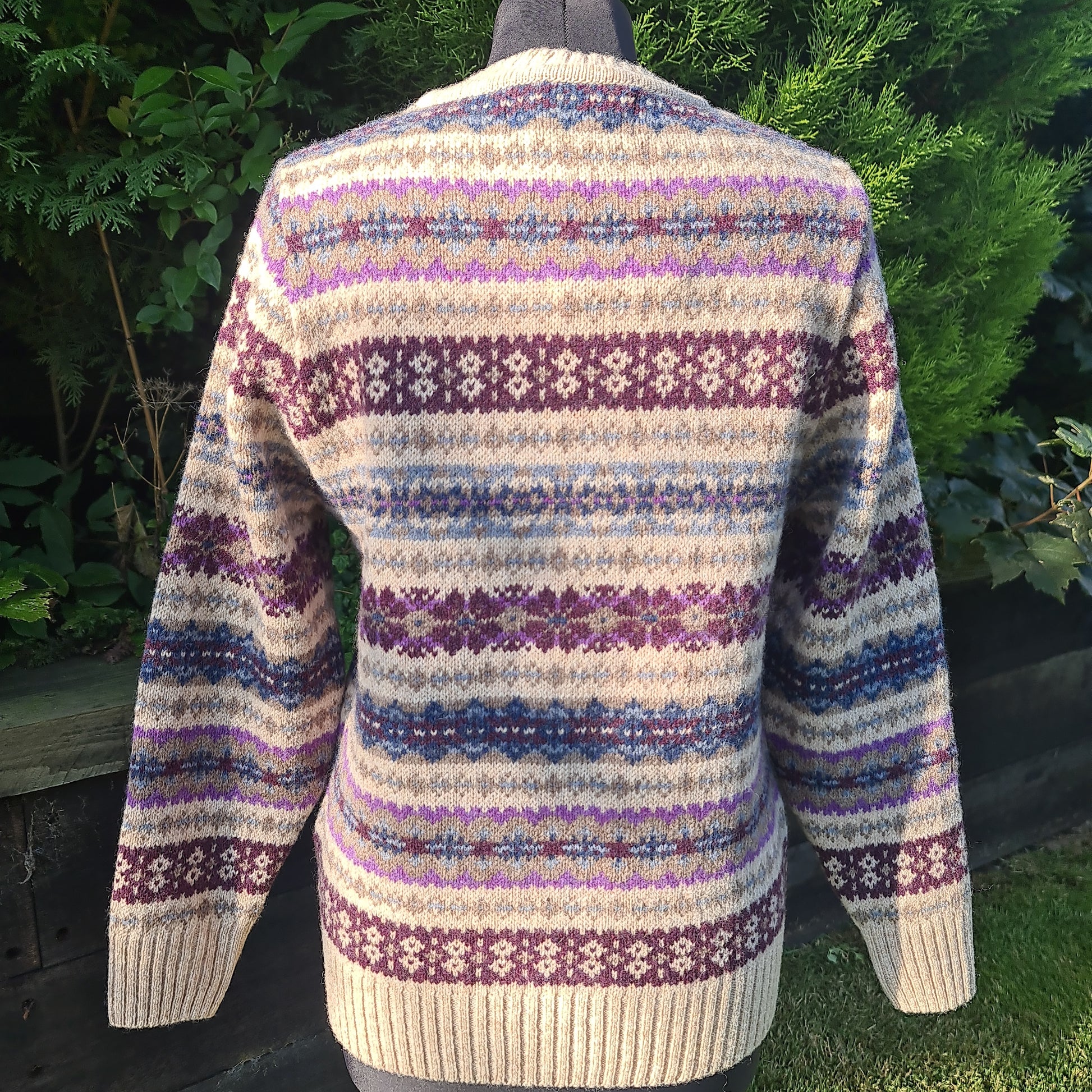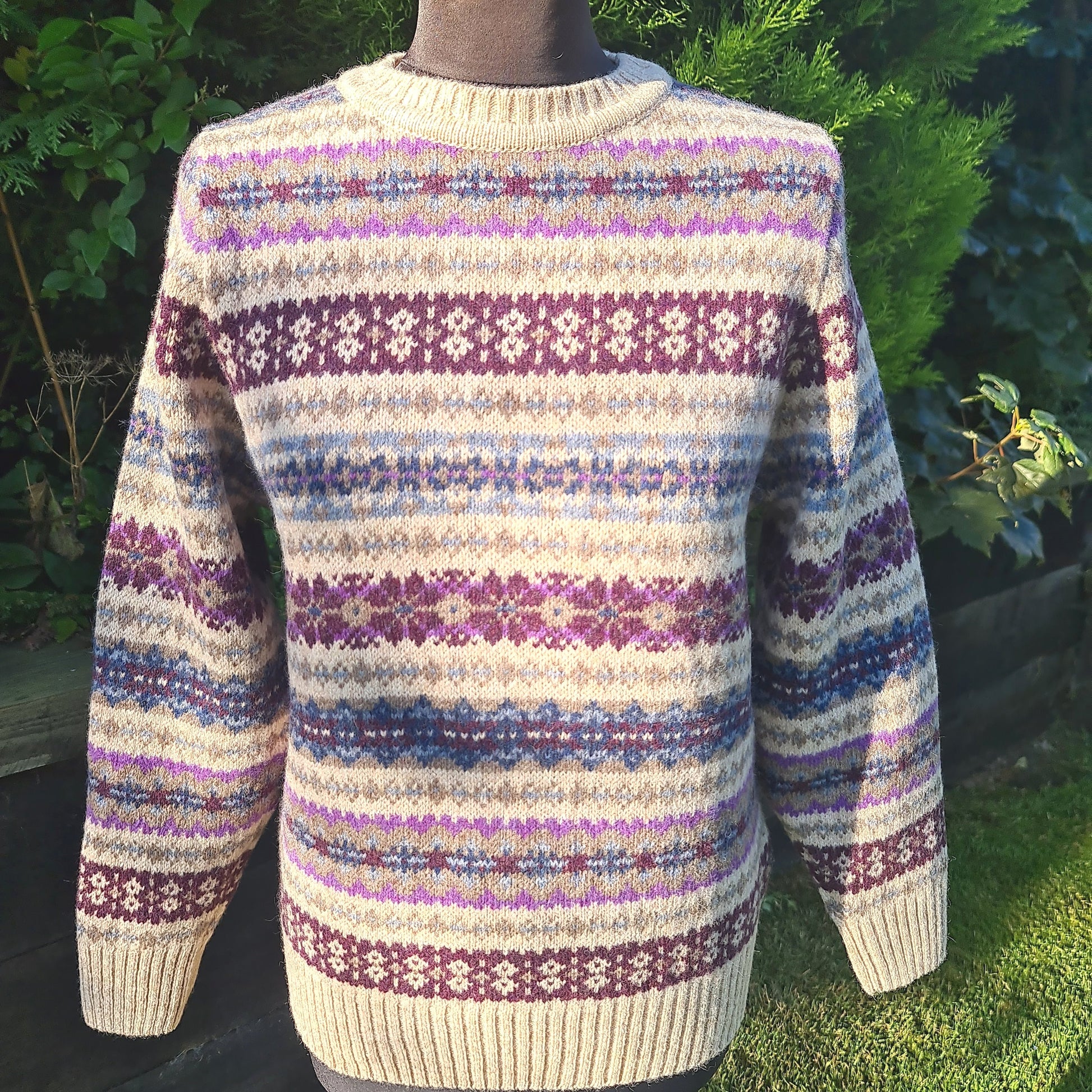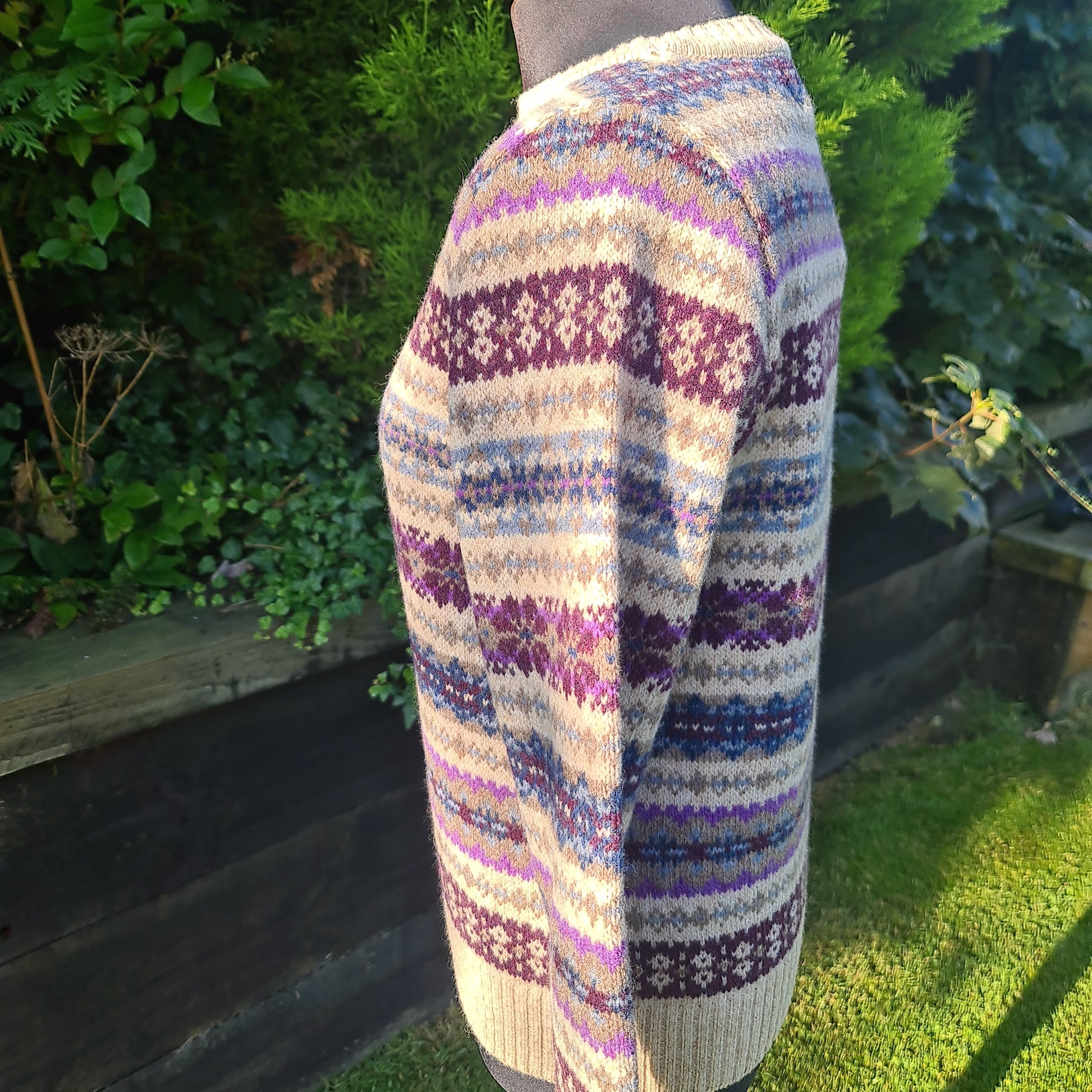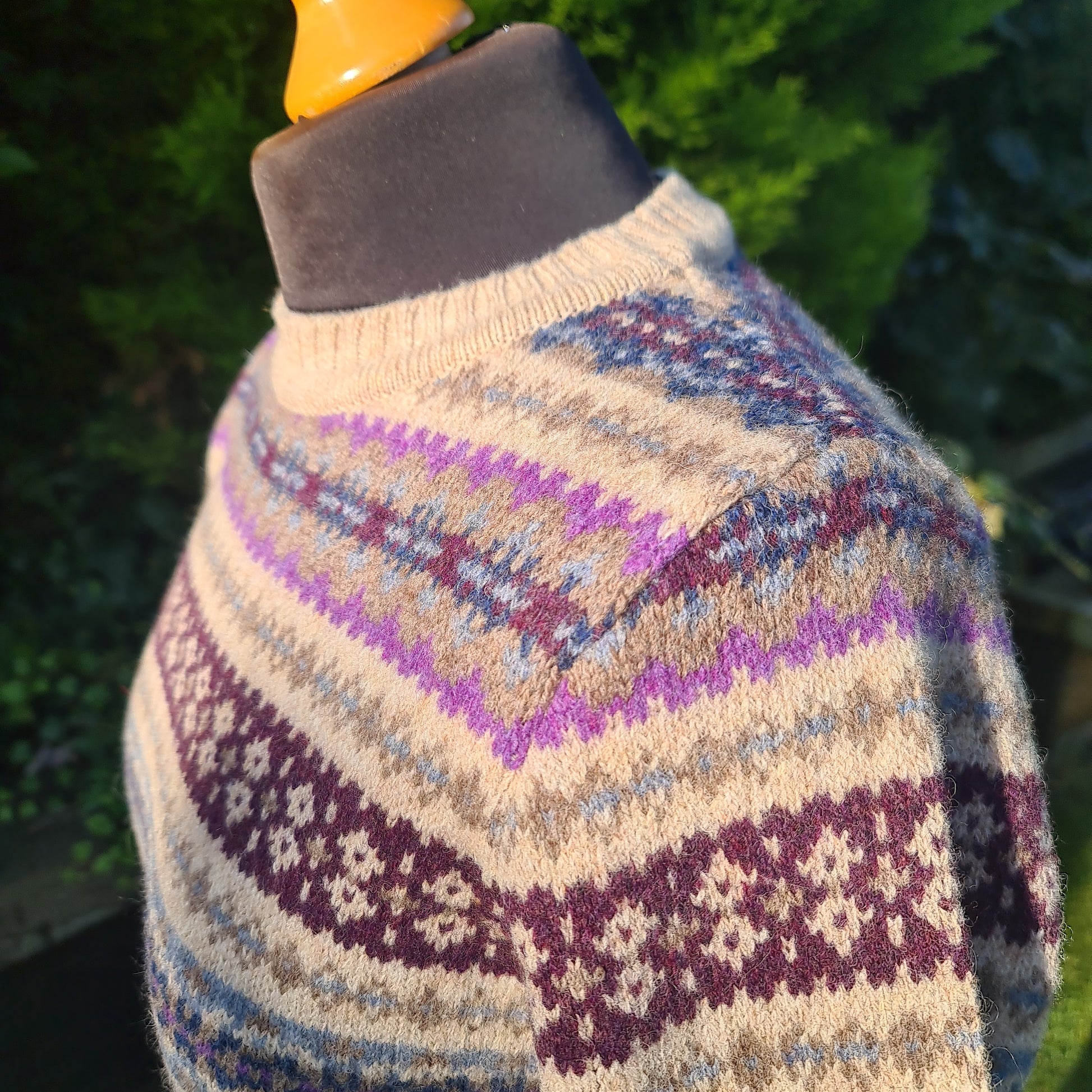 A beautiful, all over fairisle sweater knit and designed in Scotland by renowned designers Harley Of Scotland, who were established in 1929.