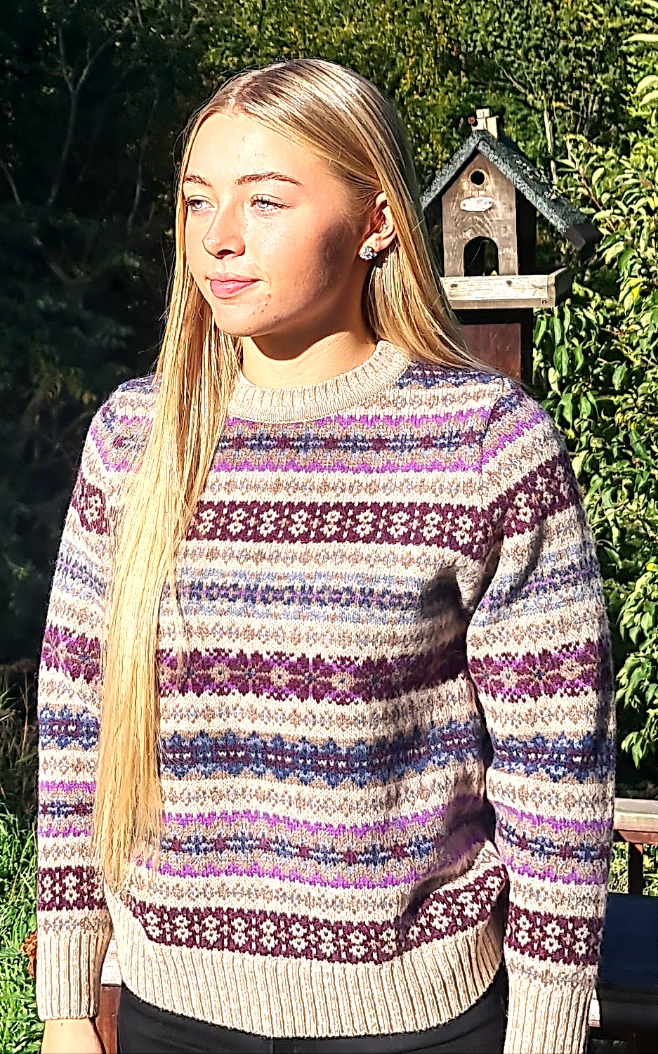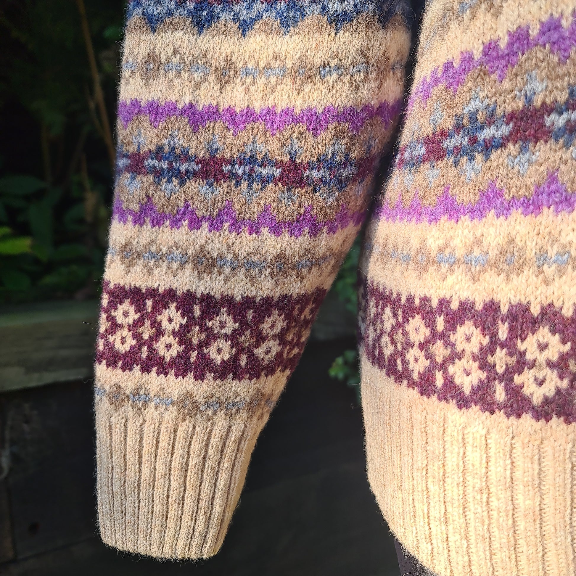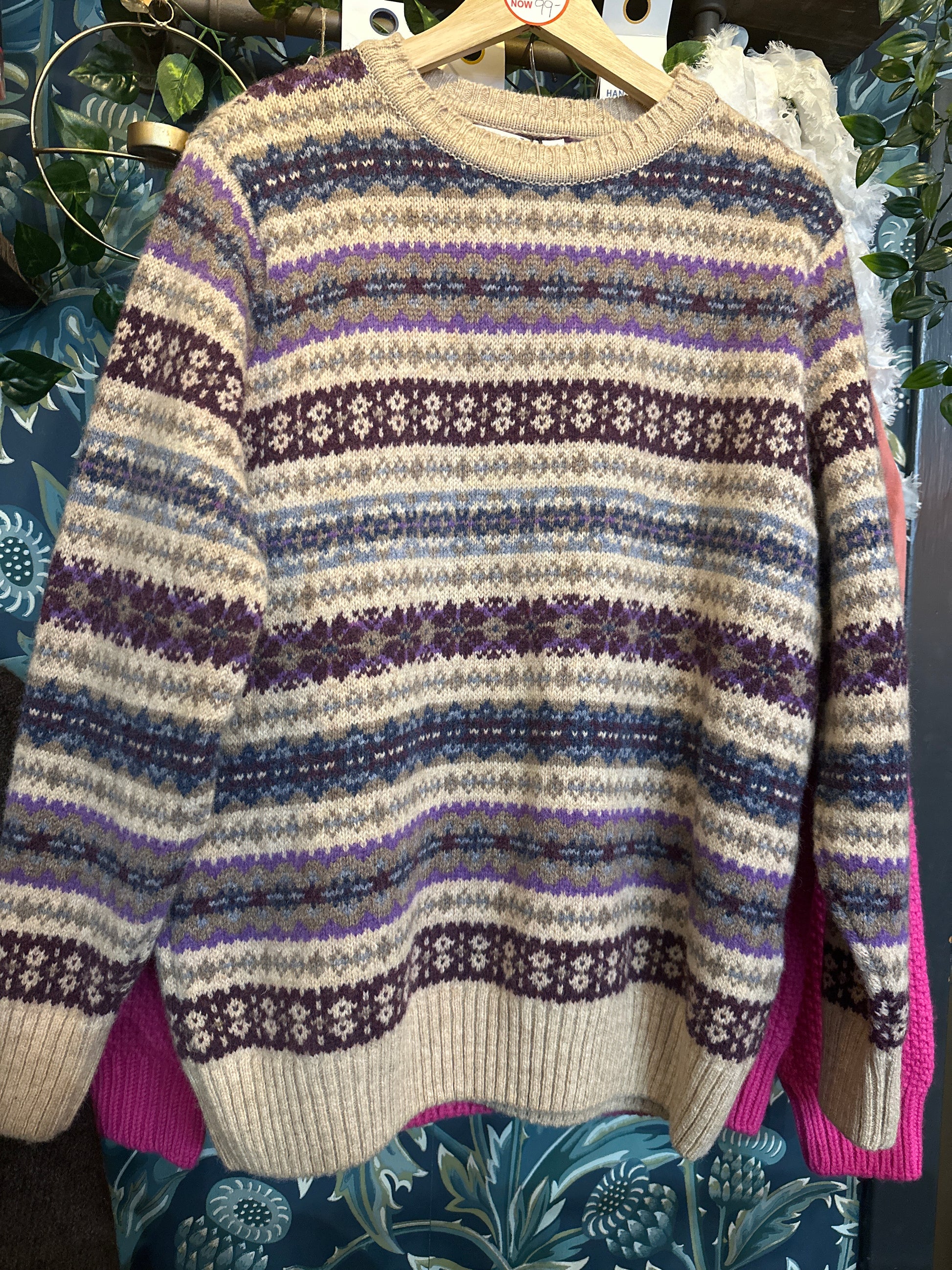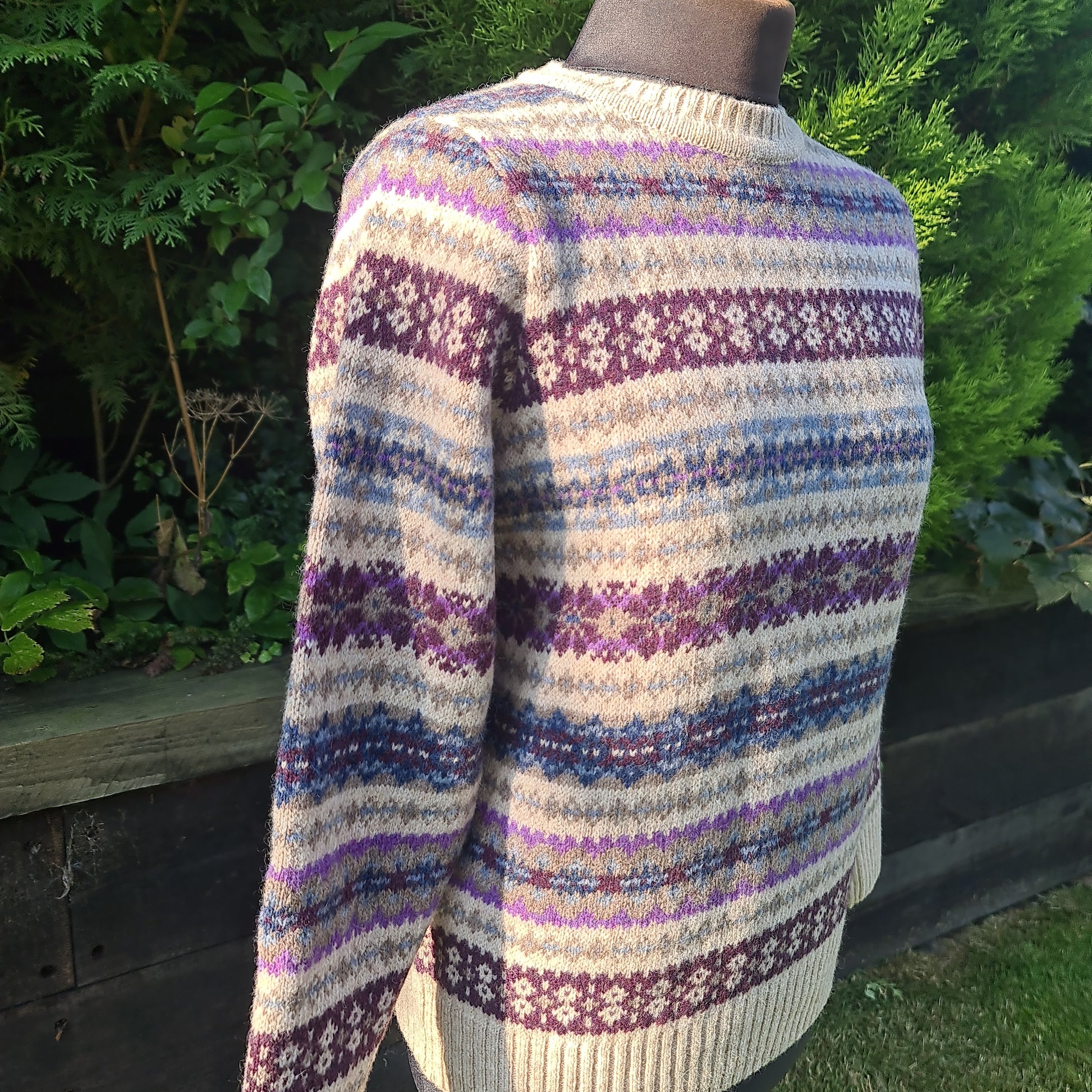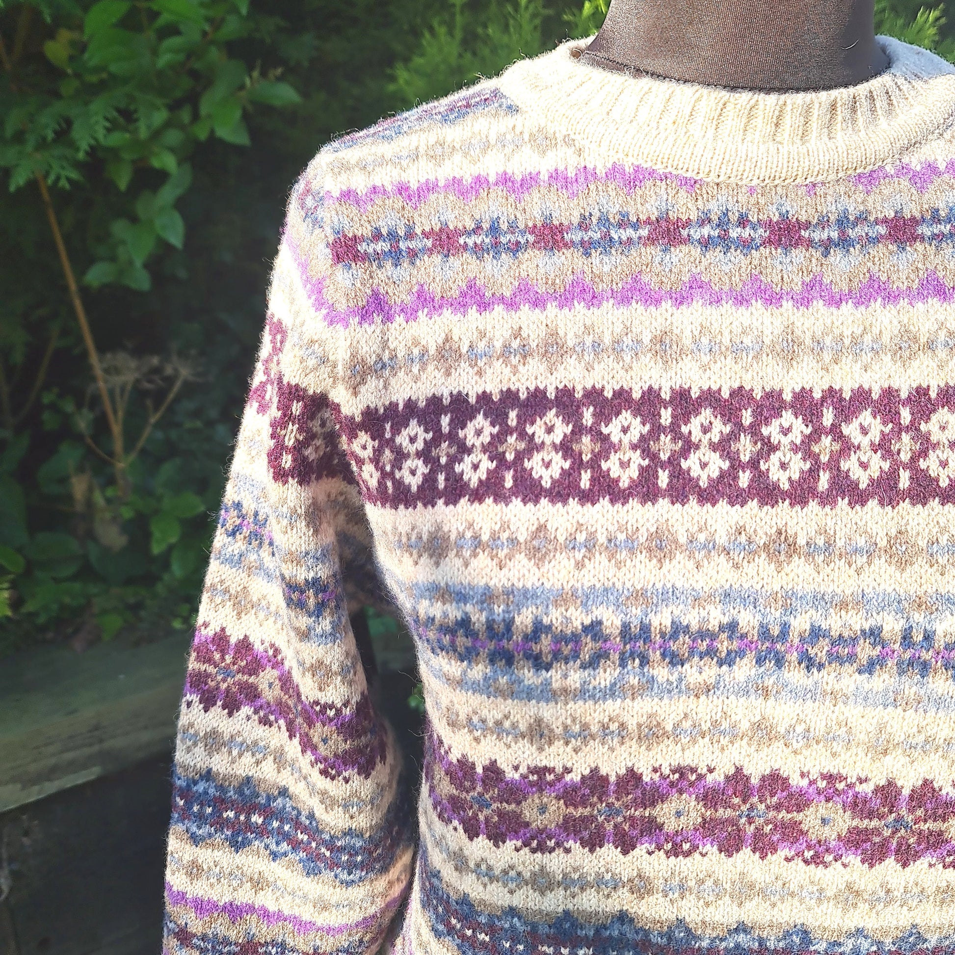 A beautiful, all over fairisle sweater knit and designed in Scotland by renowned designers Harley Of Scotland, who were established in 1929.