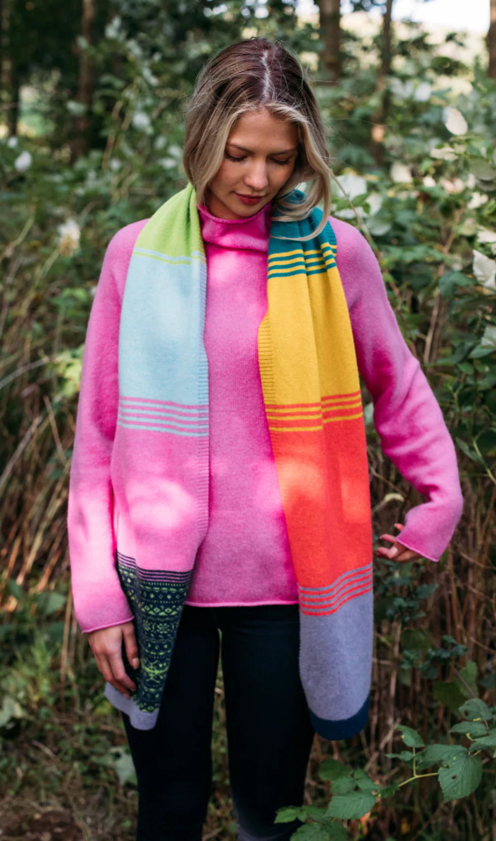 The new Alloa stripe scarf in Molly-Calla is a real head turner! A wider scarf, in a soft fleece finish, with a mix of bold blocks of colours, stripes and one section of two tone Fairisle patterning that can be wore alone of with Eribe’s matching accessories.