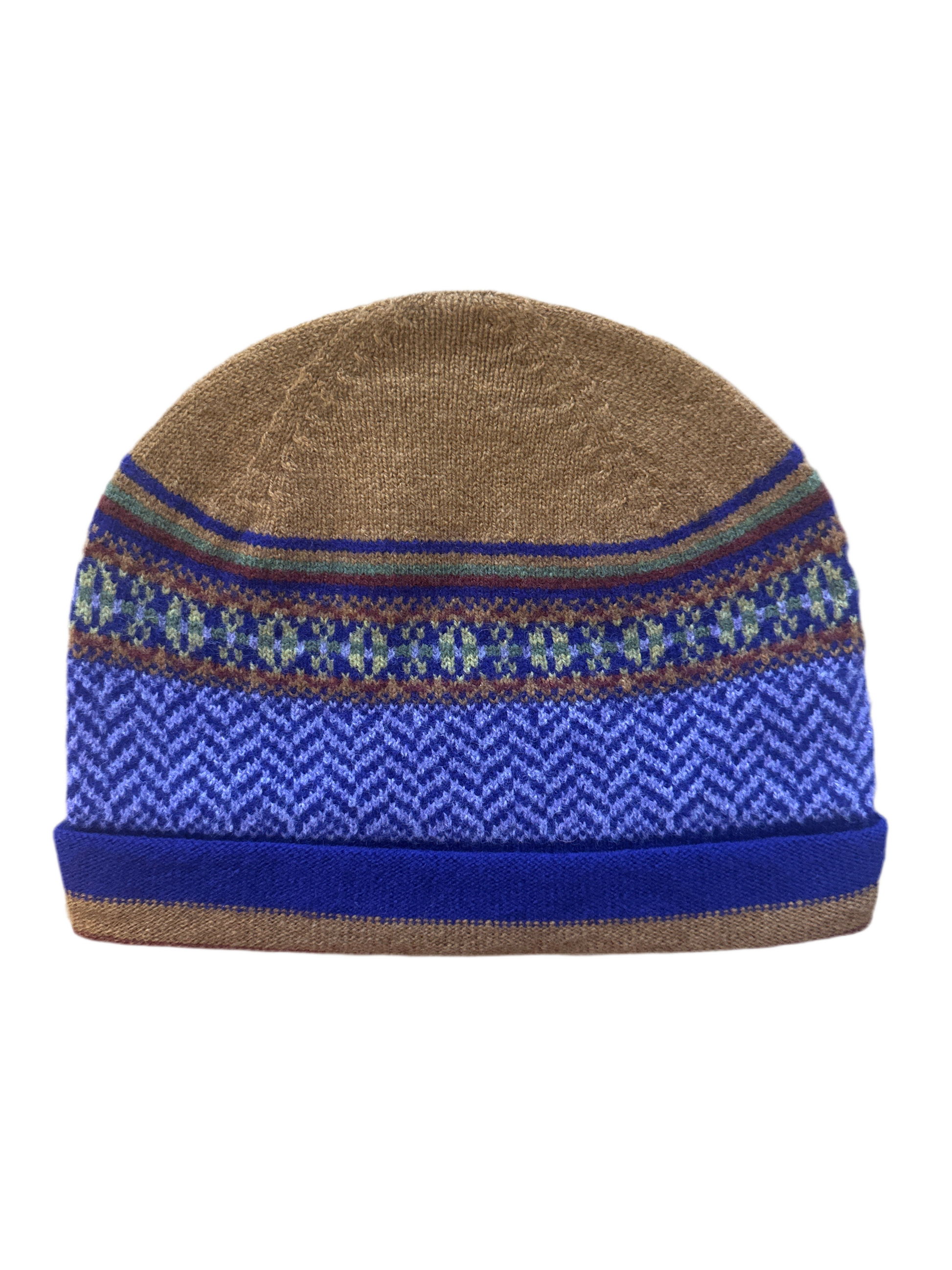 A beautiful unisex colourblock beanie with fairisle stripe design, manufactured by talented contemporary designers Eribe.