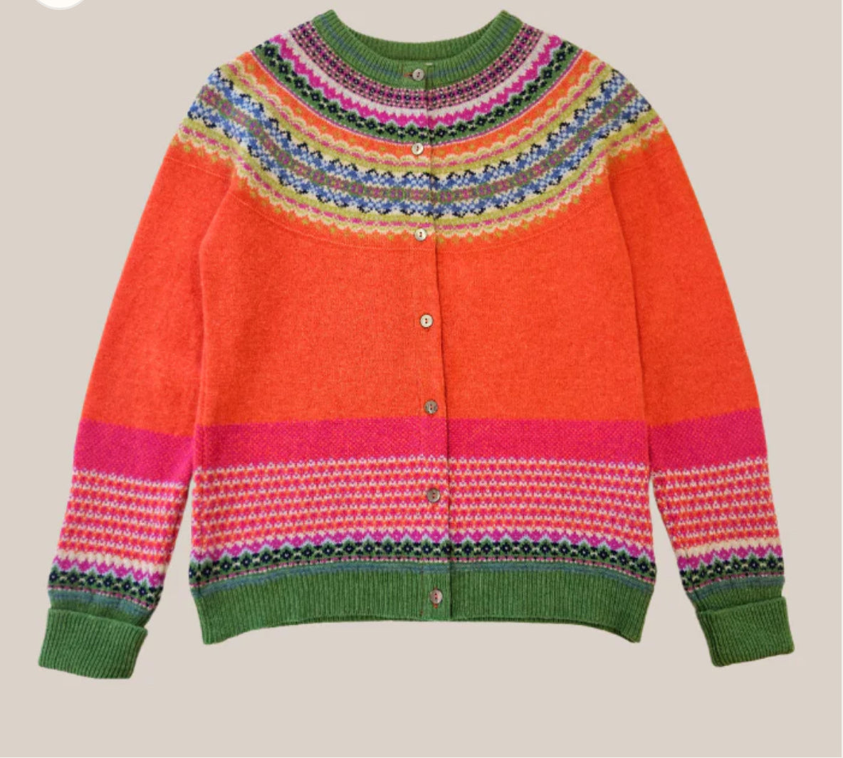 This is an Eribe signature style cardigan, the iconic fairisle pattern yoke Merino Wool cardigan has a slightly shaped waist for a flattering fit and a touch of luxury angora in the yoke for added soft texture.