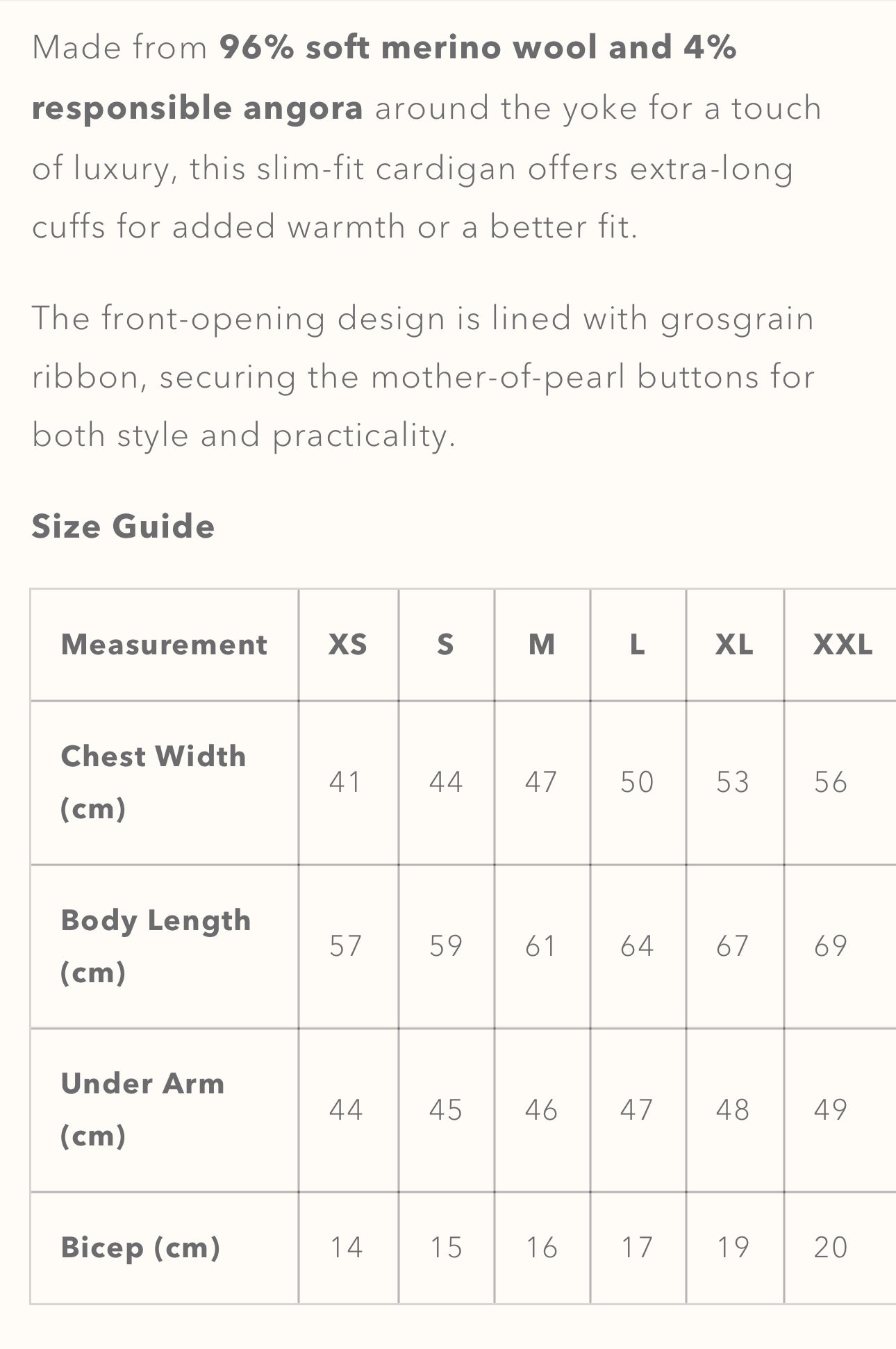 This is an Eribe signature style cardigan, the iconic fairisle pattern yoke Merino Wool cardigan has a slightly shaped waist for a flattering fit and a touch of luxury angora in the yoke for added soft texture.