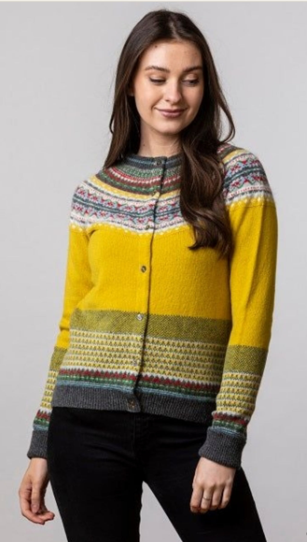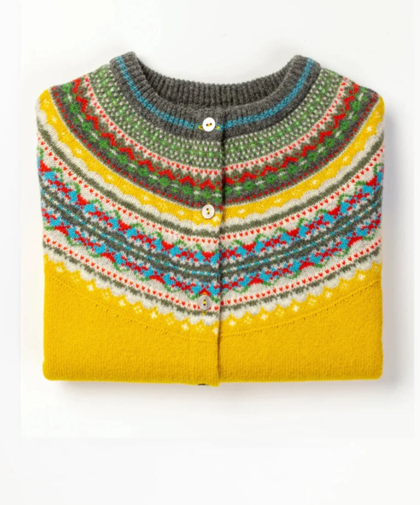 This is an Eribe signature style cardigan, the iconic fairisle pattern yoke Merino Wool cardigan has a slightly shaped waist for a flattering fit and a touch of luxury angora in the yoke for added soft texture.