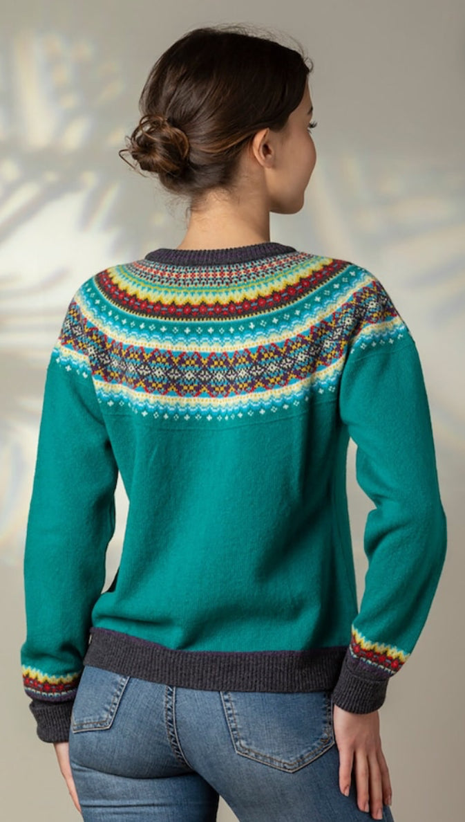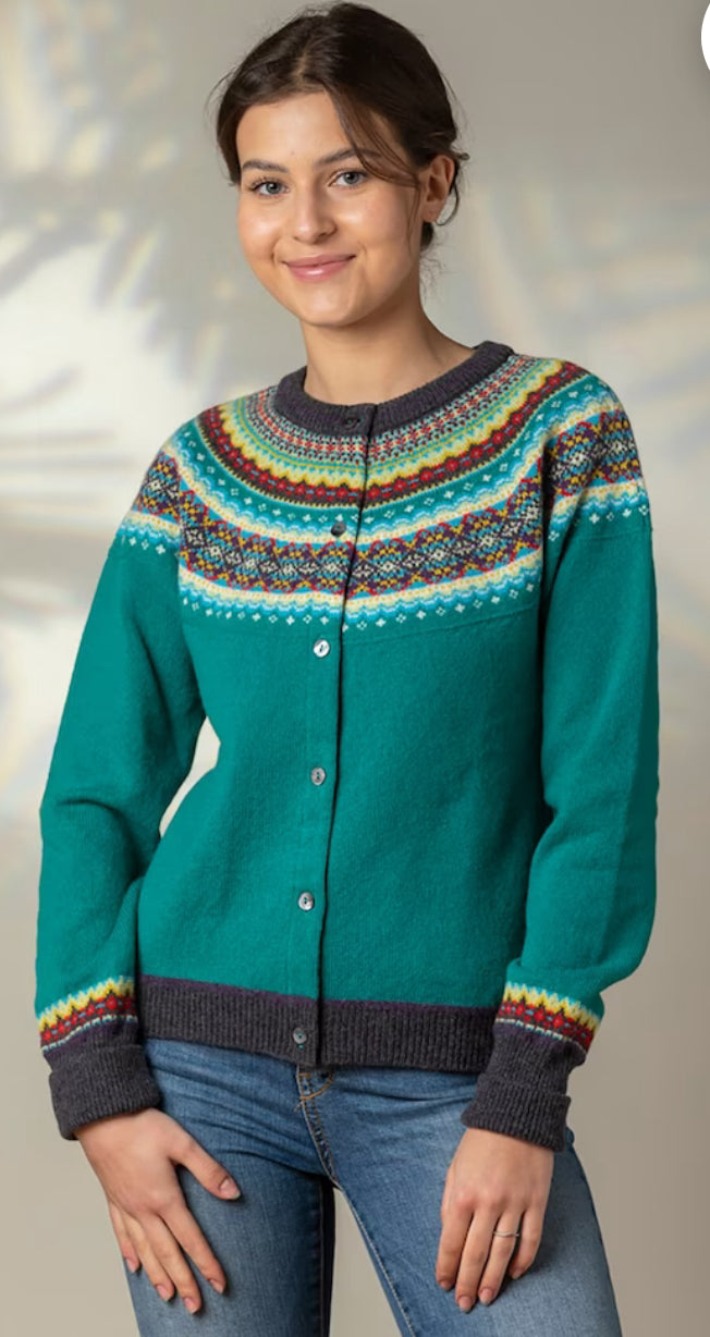 This is an Eribe signature style, the iconic fairisle pattern yoke Merino Wool cardigan. This Alpine classic has a slightly shaped waist for a flattering fit and a touch of luxury angora in the yoke for added soft texture.