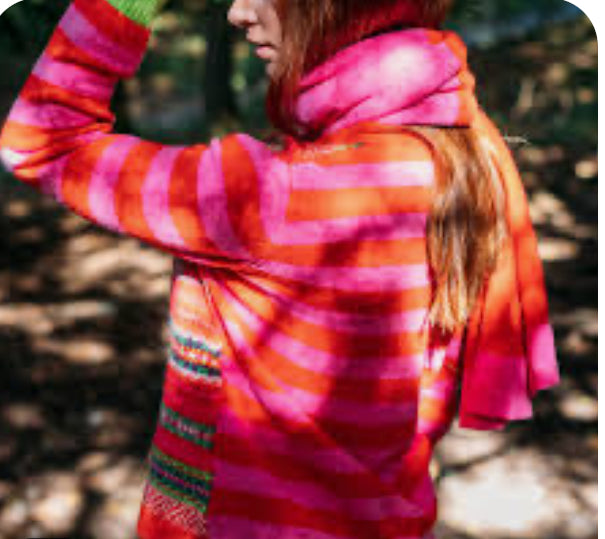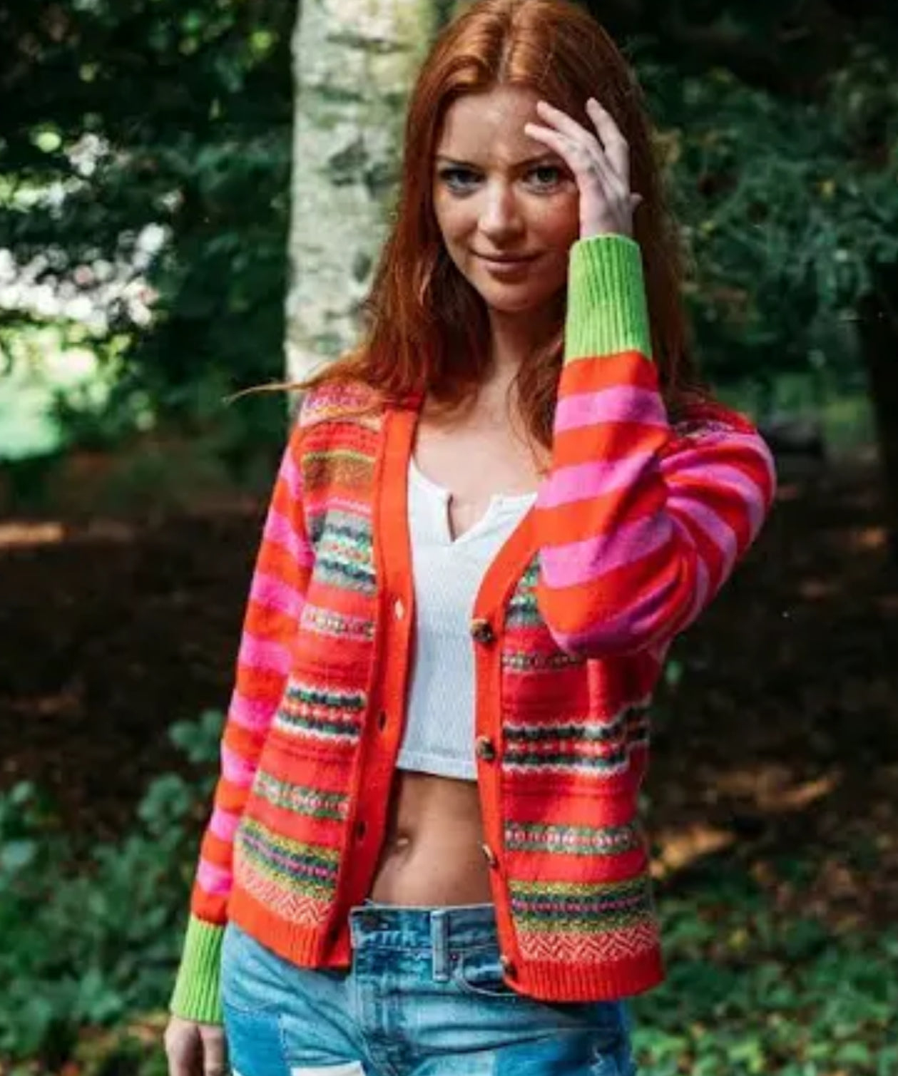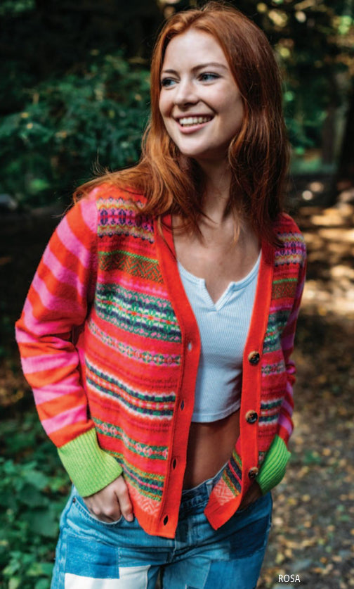 A Funky vee-neck cardigan with a charming Fairisle pattern on the front and striping on the back and the sleeves. With contrasting rib cuffs.