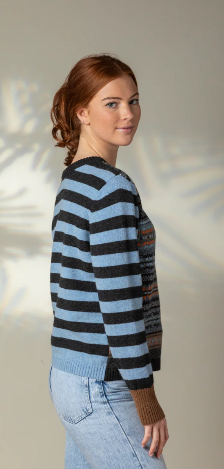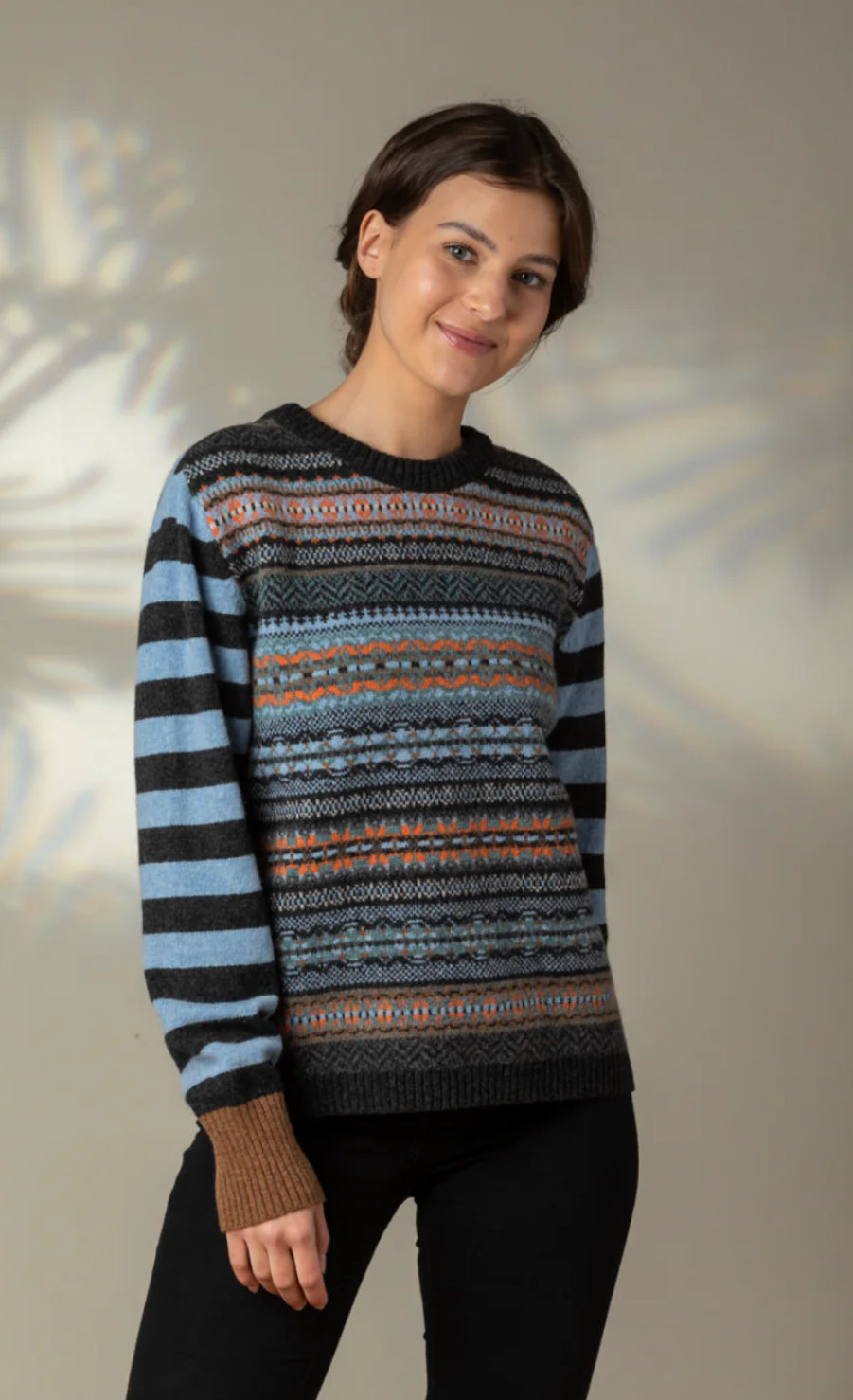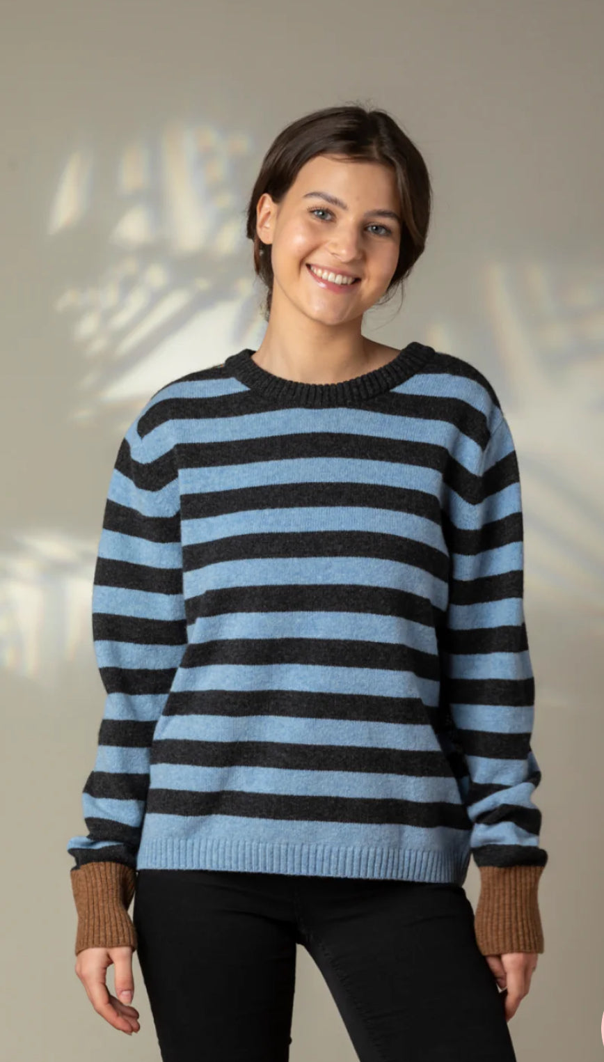 Eribe describes this new Stobo sweater as ‘bursting with joy’ this fun loving sweater is knit using the softest 100% Merino Lambswool with rib cuffs in contrasting colours.