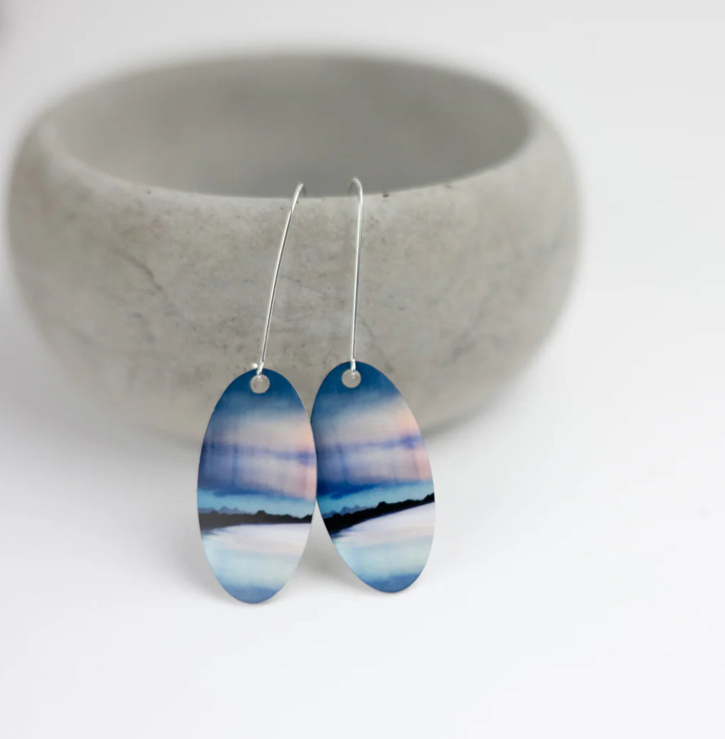 Cath waters Scottish landscape artwork on lightweight, hypoallergenic, glossy aluminium, pendant earrings with a 3.6 cm long solid sterling silver ear wires presented in a black 2 piece gift box.
