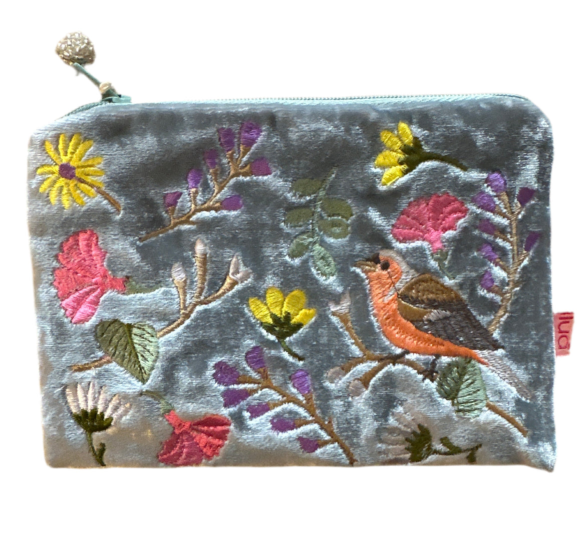 Lovely velvet purse designed by Lua Designs with a beautiful embroidered bird & gardens to the front.